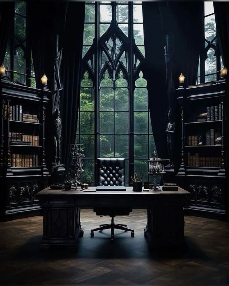 Позади Вильяма, что сейчас сидел на высоком кресле с отбивкой из чёрной кожи, располагалось большое арочное окно, с почти что готическими переплётами, открывающие вид на любимый лес Вильяма, через которое сейчас светил утренний свет, наполняя комнату приятным освящением. Окно слегка прикрывали тёмные длинные шторы, монотонно чёрные, из какого-то мягкого и бархатного материала.