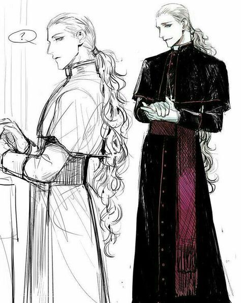 Его нынешний "образ". Длинные платиновые волосы, собранные в хвост, ряса священника с крестом на груди. Чуть изменённое лицо его… прежнего, ангельского, облика. Фиолетовые глаза. Вот и весь образ.