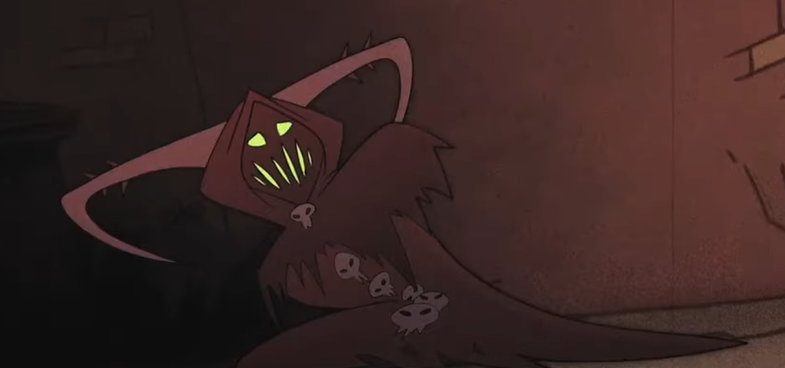 Коричневый балахон, с "линией" небольших черепков на месте молнии, с тёмно-коричневым капюшоном, из которого выглядывали лишь длинные белые рога, что словно односторонне кирки, смотрели вниз, на каждом роге было по четыре мелких шипа, параллельно друг другу, где-то на конце рогов, чуть дальше от места закругления.