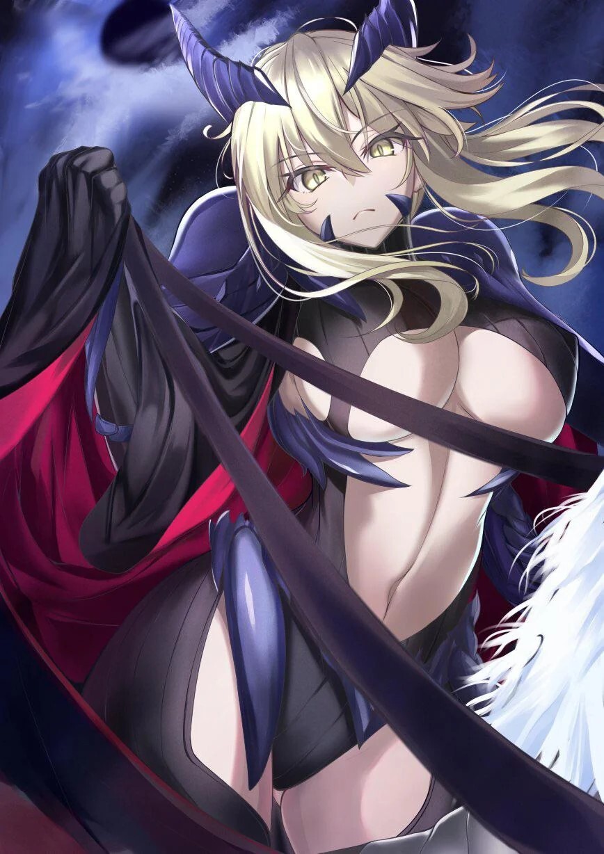 Слуга класса Сэйбер Артурия Пендрагон была откровенно миниатюрной красавицей даже в черных шипастых доспехах, покрывавших большую часть ее тела. Ее светлые волосы, щедро одаренные поцелуями солнца, теперь были ближе к серебристому оттенку луны, но все еще отчаянно держались за свой золотистый отблеск. Но больше всего Артурия выделялась своими призрачными золотыми глазами, которые сияли подобно звездам на ее бледном лице, особенно выделяясь на фиолетовом свете, исходящем от испорченного Грааля позади нее.