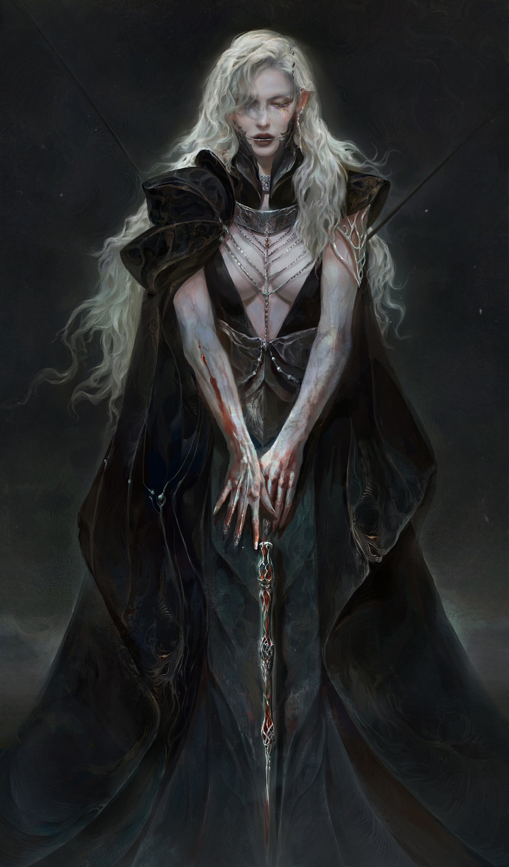 Внутри, под разрушенной статуей бога, находился одинокий трон пропитанный самой тьмой, на котором восседала женщина. Словно статуя, она застыла в одном положение и лишь изливающееся из тела духовное давление, что окутало все пространство, говорило о том что она жива.