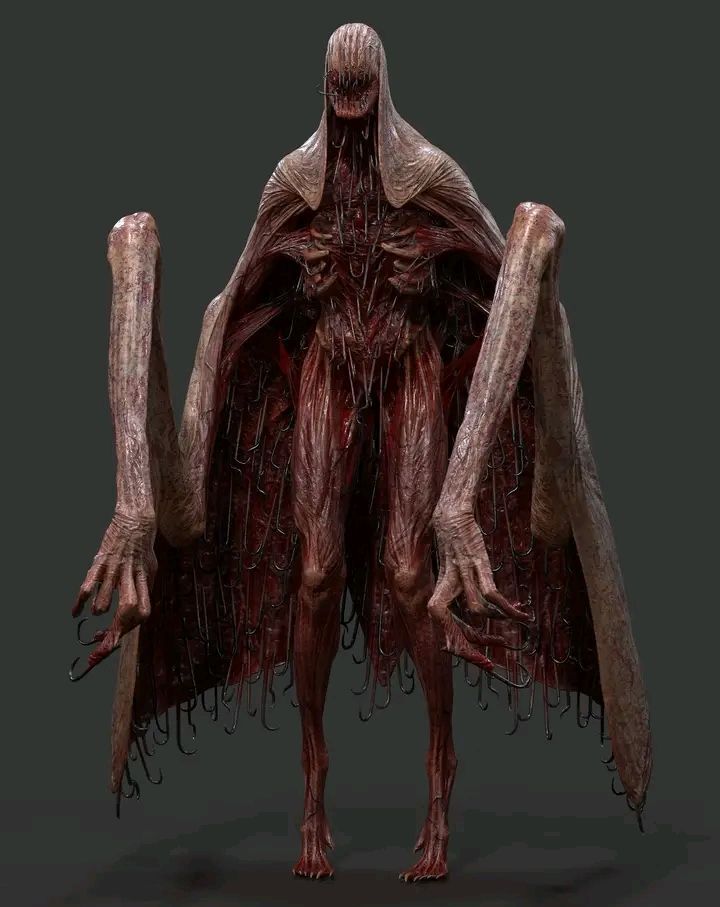 Третья же образина, кардинально отличалась от двух предыдущих. Начнем с того, что она умела летать, благодаря своим огромным рукам, частично смахивающие на руки птеродактиля. Но разница была в том, что часть рук, а именно предплечье, была оставлена для удобного захвата различных целей, и они могли действовать без нарушения полёта, ведь ноги для этого были не предназначены. Крылья же, напоминали собой какую-то одежду с прочным внешним покровом, окутывающее основное тело монстра. Дальше идут рты, коих у чудовища целых две штуки. Первый рот находиться на законном месте, в голове без глаз, напоминающая капюшон одежды. А вот второй рот, располагался в раскрытой грудной клетке тела, некогда бывшего человека. Да, все эти монстры, если тщательно в них вглядеться, очень похожи на людей, и я думаю, что ими они раньше были, но над ними знатно поработали. Последней примечательной чертой твари, было само тело, которое было полностью оголено и забито железными крючками, вросшие внутрь, а также, у него отсутствовали половые признаки.