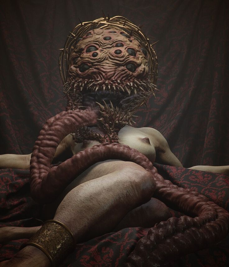 Первая тварь выглядела довольно миленько, это явно когда-то был человек, а точнее женщина, ведь об этом говорила вся её часть тела от шеи вплоть до ног, а вот голова уже была совсем иной. Её нижняя часть была полностью отдана в угоду ротовой полости, в следствии чего, она была ужасно деформирована и усыпана огромными иглообразными зубами. Из этого огромного рта, выходил язык в длинною метр и толщиной в несколько десятков сантиметров, с мужественными дырками, откуда вытекала черная жижа. Верхняя же часть, была предназначалась только для глаз, коих было с десяток штук, в форме круглых бусинок полностью чёрного цвета.