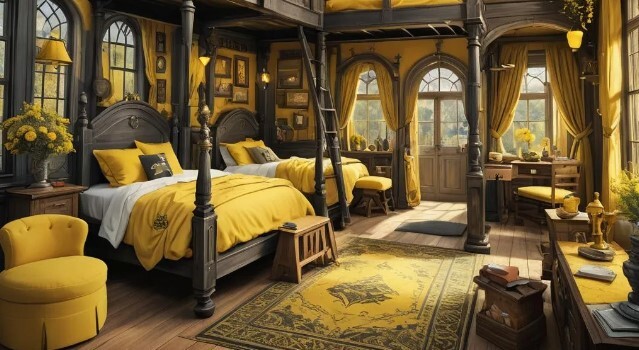 Напротив входа расположился камин с зажженным огнем, что добавляло 100 очков к уюту этому месту. На большой деревянной каминной полке медового цвета с вырезанными на ней барсуками располагались до блеска наполированные награды и кубки, а над всем этим висел большой портрет основательницы факультета.