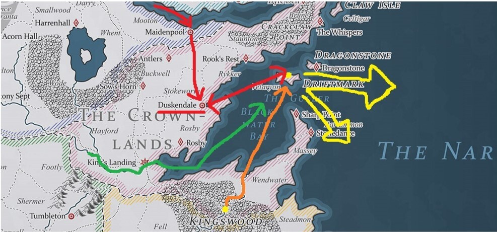 Следом место Дарклинов в Семеречном Доле заняли Риккеры, бывшие до этого самым обычным рыцарским родом из королевского домена. Опустим детальный сказ о том, что для установления полного контроля им пришлось серьёзно расстараться, договариваясь с множеством побочных ветвей сгинувших Дарклинов и прочими «заинтересованными», и перейдём к итогу — им всё удалось… при негласной, но ощутимой поддержке Таргариенов, конечно же. Именно поэтому Риккеры до конца воевали за низвергнутую ныне династию и одними из последних присягнули Роберту на верность, но на этом всё не закончилось. Падение дома Таргариенов нарушило баланс внутри города. Всё, эпоха миновала, у Риккеров больше нет «королевской крыши», и теперь всё чаще и громче внутри города раздаются голоса на один и тот же мотив, мол, с какой это стати городом правят Риккеры, а не Дарки, Дарквуды или Даргуды? И это всё на фоне стабильно ухудшающегося положения города, ведь истинные причины восстания Сумеречного Дола никуда не делись, а только обострились из-за разорения города королевскими войсками. Одна из этих причин — простая данность, что Королевская Гавань, как столица и крупнейший торговый узел, экономически душит вотчину Риккеров, переключая торговые пути на себя. Это естественный процесс и уже необратимый, но Сумеречный Дол всё-таки имеет одно любопытное стратегическое преимущество — своё расположение. Нужно лишь взглянуть на вопрос под правильным углом.