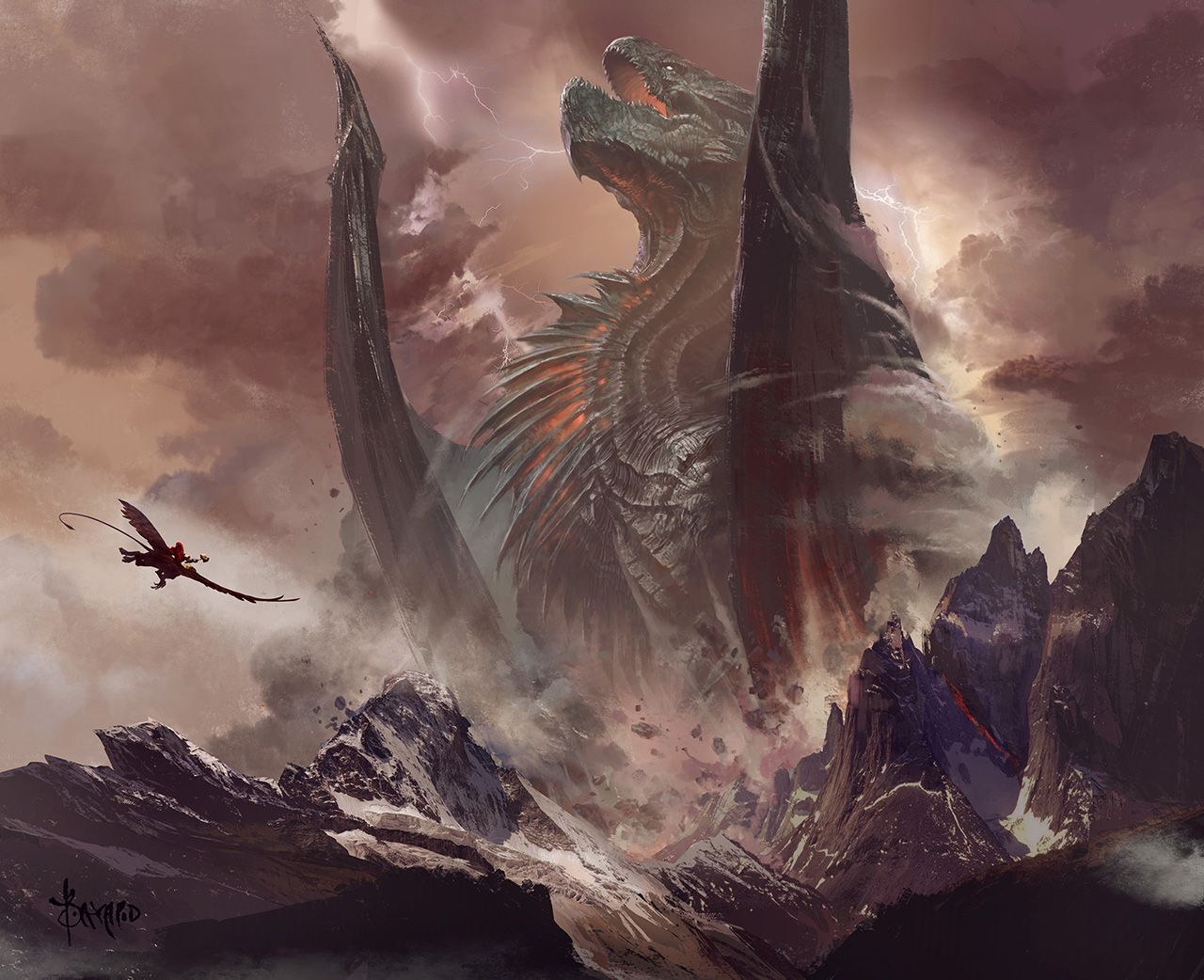 Земля задрожала. Матэо встал в твёрдую стойку, готовясь к худшему. И вот огромная туша разрушила чуть ли не весь фасад замка. Прямо из горы вылетело огромное существо, чьи крылья способны обнять небеса всех Девяти Миров. Его бесконечная тень закрывала чуть ли не всю горную цепь. Существо неведомых размеров кружило в небе, рыча от злости. Любой другой бы давно наложил в штаны и убежал восвояси, но только не Матэо, который очень внимательно следил за противником.