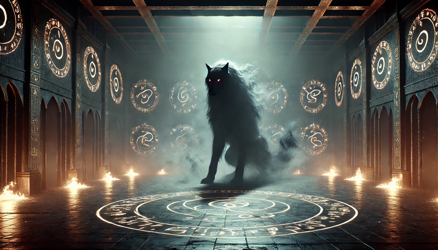 Это была особо крупная особь, в холке достигая полтора, а то и все два моих роста. Длинная чёрная шерсть, переходящая в такой же тёмный, непроницаемый туман, что начал заполонять округу. Острые когти, металлического отлива, что царапали полы арены при каждом шаге, высекая искры. Гулкое рычание, тяжёлое дыхание, я чуял смрад из его пасти на расстоянии в десятки метров.