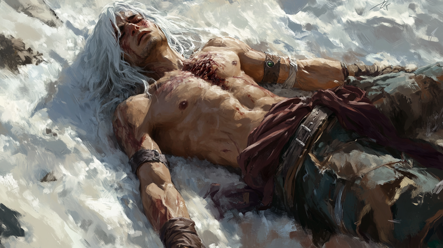 Стоило пройти буквально пару десятков метров, как они наткнулись на тело, лежащее в снегу. Это был высокий, не меньше какого-нибудь альтмера, мужчина с белыми волосами. Нижняя половина его тела была закована в латы, а выше пояса он был практически полностью голым, если не считать каких-то лохмотьев. Тело этого мужчины было покрыто шрамами, самый ужасный из которых был на груди. Но сколько бы легионеры не пытались рассмотреть странного воина, они так и не обнаружили ни одной свежей раны.
