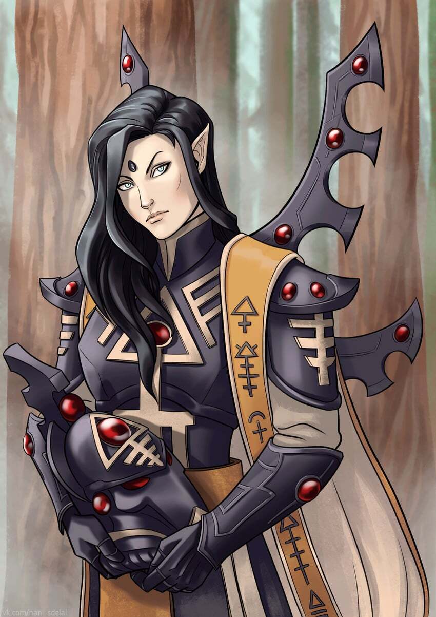 Выглядела она так же, как и в прошлые встречи. Длинные, зачёсанные на правую сторону чёрные волосы обрамляли худощавое вытянутое лицо с пронзительными раскосыми глазами синего цвета, длинным носом и тонкими губами. На лбу был прикреплён тёмный кристалл неизвестного назначения, а острые уши выбивались из причёски. Одета Элратиль была в уже знакомый мужчине чёрный доспех эльдарских колдунов, весь украшенный рунами и оберегами, а в руке держала резной посох.