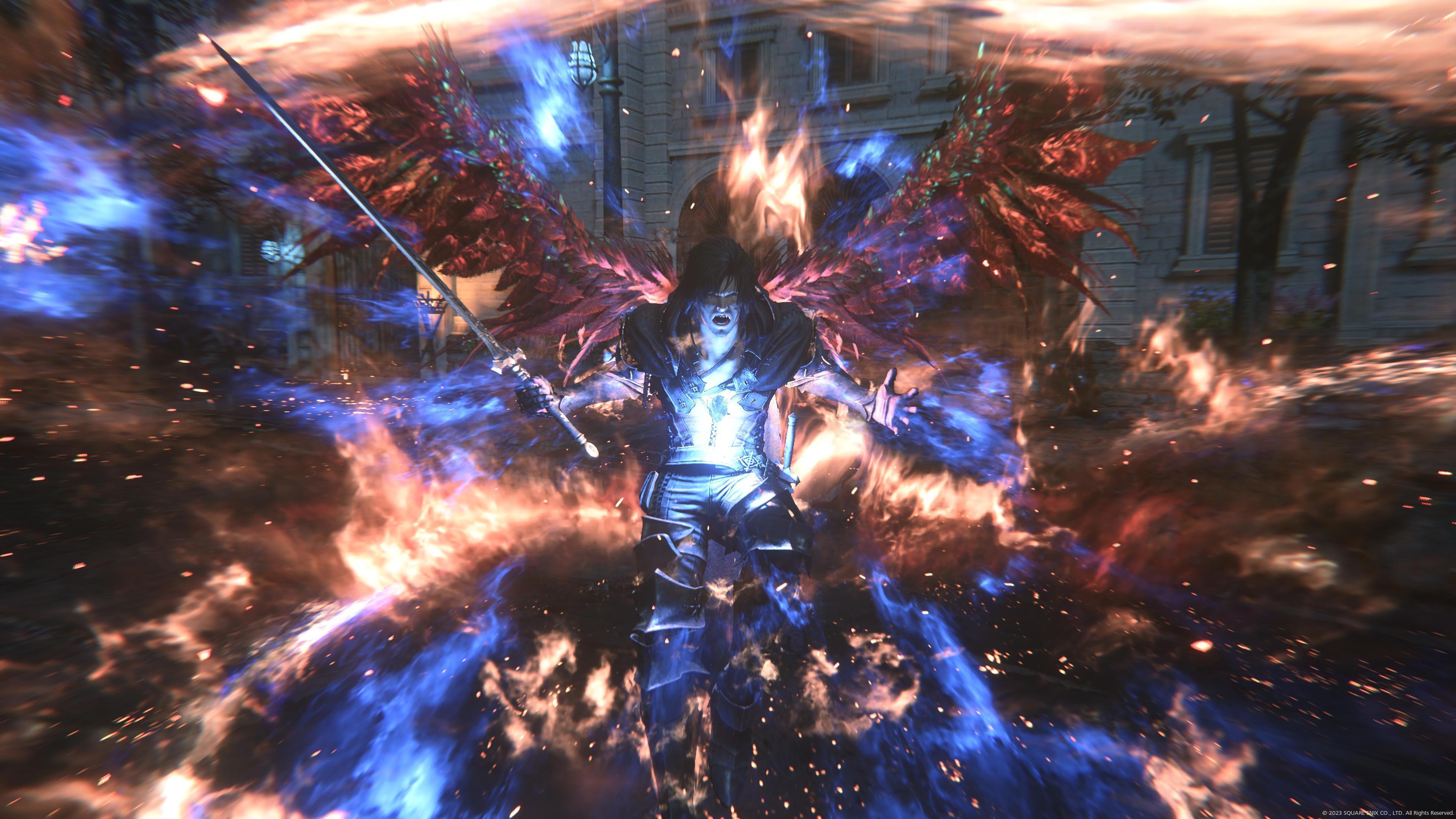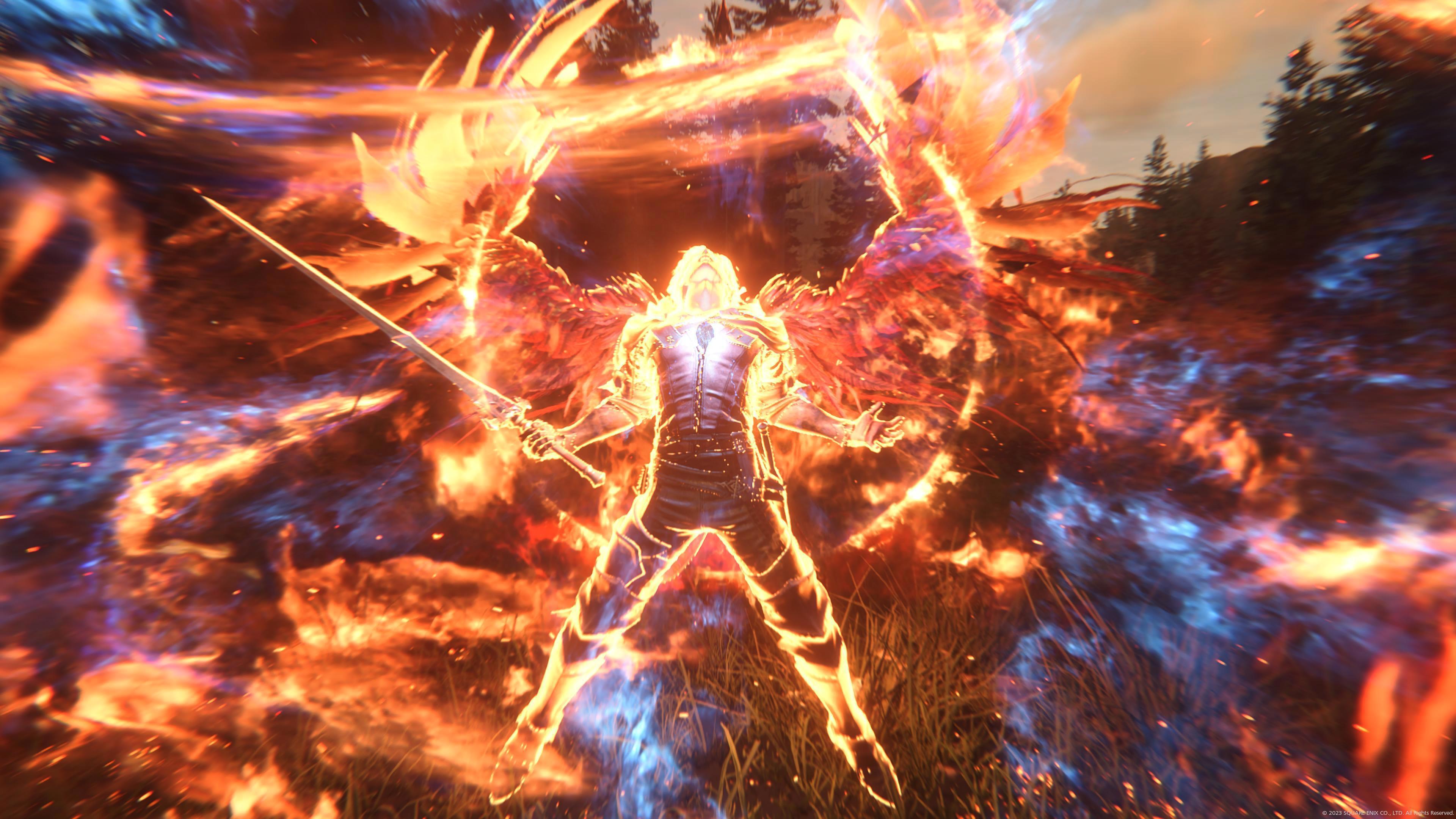 Стиснув зубы, Клайв поднялся на ноги и с нечеловеческой решимостью устремил взгляд на огромный глаз. Фигура мужчины вспыхнула пламенем, за спиной выросли крылья феникса.