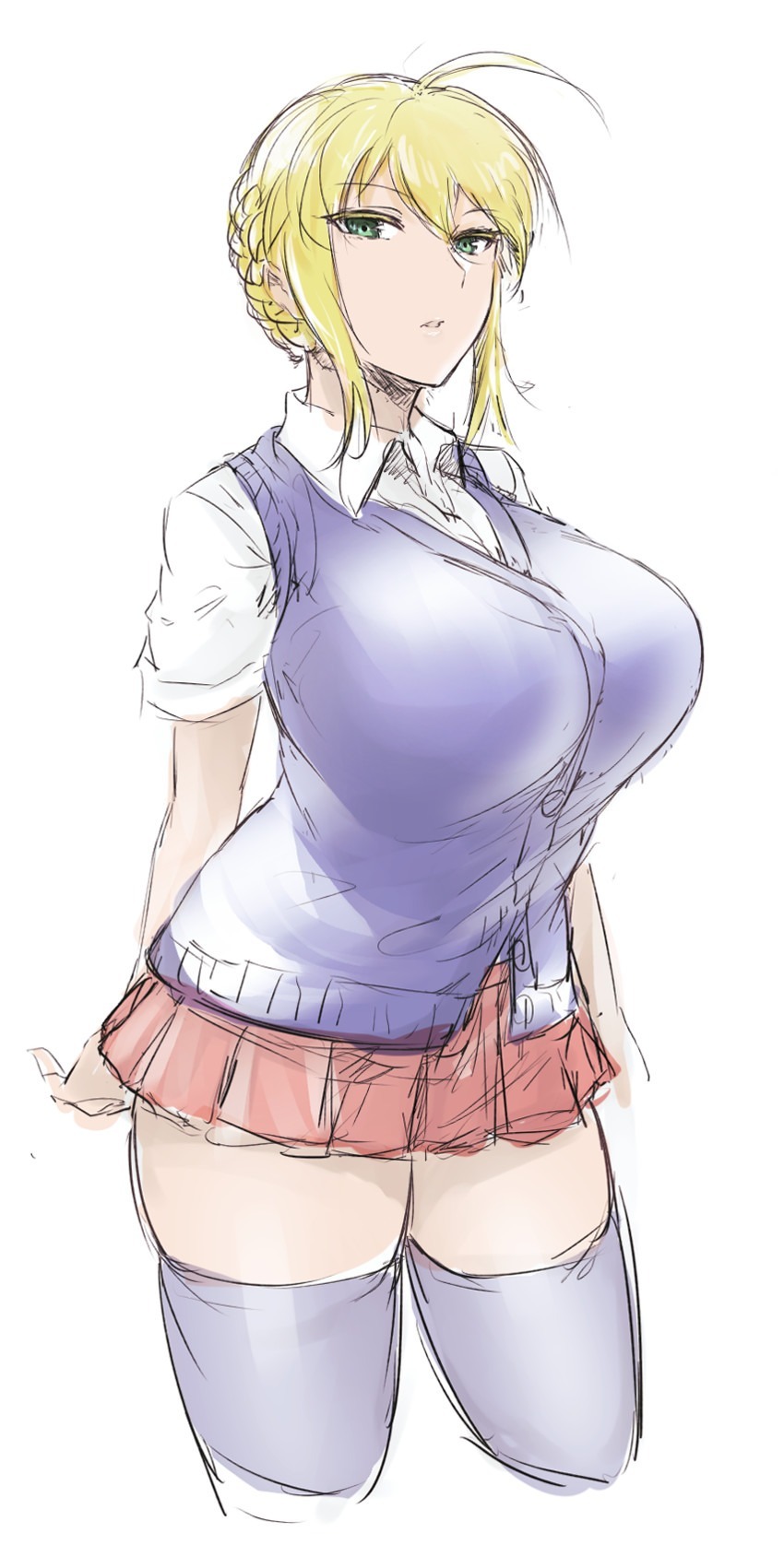 Узрев эту картину, у юного Хедо неосознанно перехватило дыхание. Облик этого создания был слишком завораживающим… Длинные, темно-голубые чулки достигали ей чуть выше колена и идеально точно передавали каждые изгибы ног богини. Красная, ультракороткая юбка, едва скрывала трусики, но при этом, мистическим образом не давала их увидеть! Шерстяной свитер синего цвета, был одет поверх белоснежной рубашки без рукавов и этот тандем едва-едва справлялся со своей непосильной задачей! Казалось еще чуть-чуть, всего лишь одно дыхание и упругая грудь порвет преграду на своем пути и выберется на свободу!