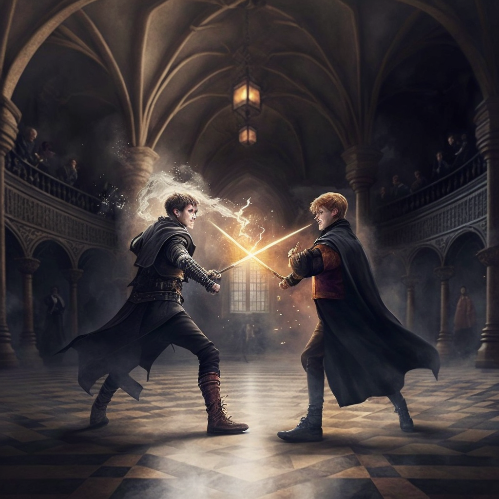 В руках их появились палочки, а в стороны противников полетели первые заклятия. Лучи разной толщины и цвета с различной скоростью направлялись к участникам сражения. Старшекурсники выставляли золотистые и синие щиты, о которые разбивались чары, перемещались по арене, отпрыгивая от летящих сгустков магии и сами посылали заклинание за заклинанием в ответ.