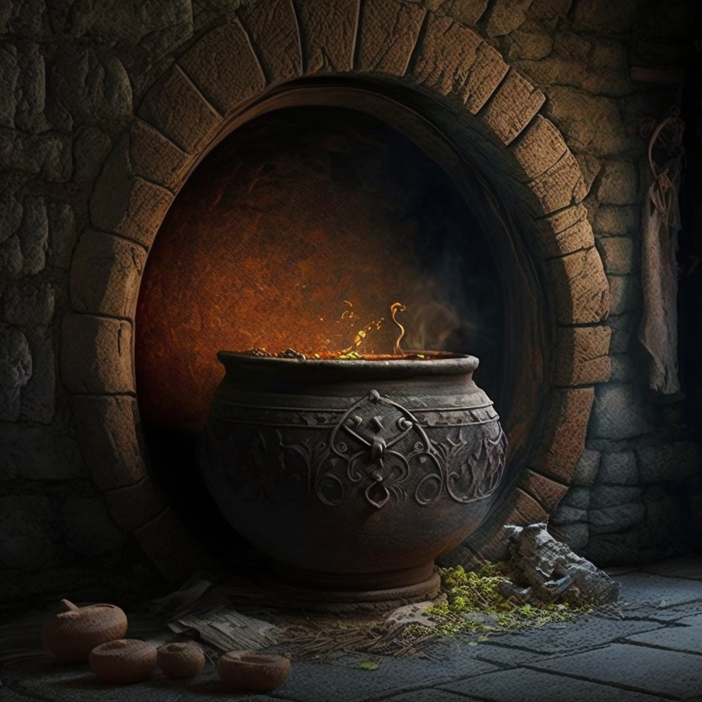 А в дальней стене заместо двери находилось круглое углубление, в котором стоял огромный чугунный котёл.