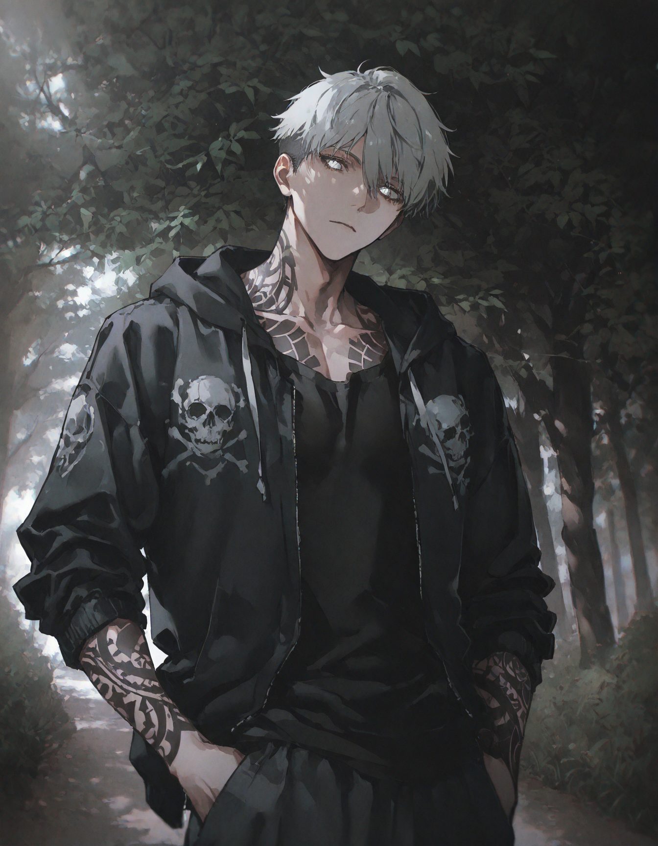 Однако опять избежала участи быть осмеянной окружающими, оказавшись пойманной крепкой рукой, схватившей её за горловину плаща. Очень жилистой рукой, ещё и полностью забитой чёрными линиями татуировок, что собирались в непонятный слитный узор и уходили дальше, скрываясь за закатанными рукавами расстёгнутого худи. Хотя… не только руки. Из-за ворота футболки виднелось ещё больше чёрных линий, затронувших боковую часть шеи.