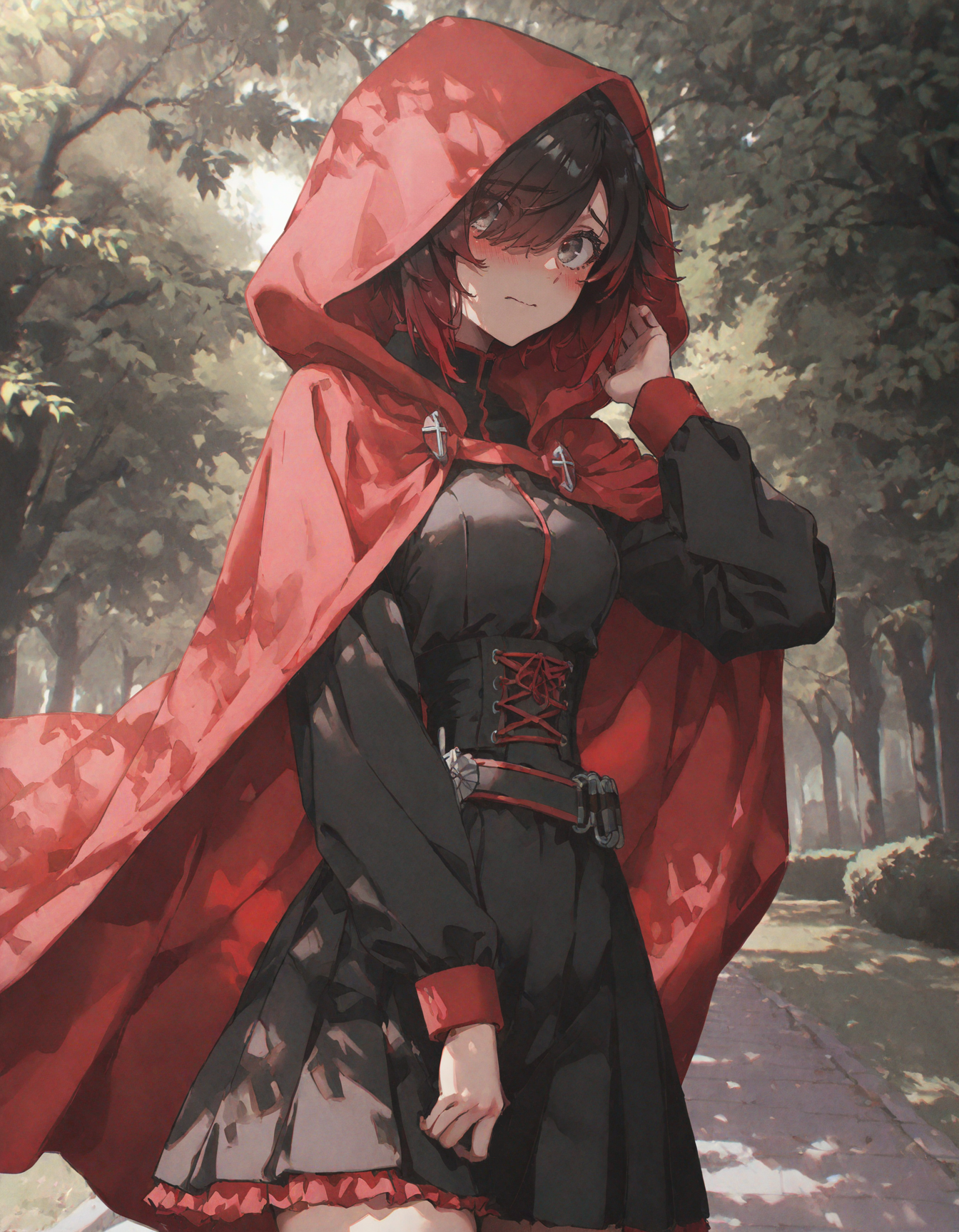 — Да, точно не нужна… — натянув красный капюшон чуть ли не до лба, Руби Роуз издала нервный смешок, морально готовясь встретить новый день с гордо поднятой головой. И затемнённым лицом. Голова ведь будет при этом поднята! Поэтому всё в полном порядке.