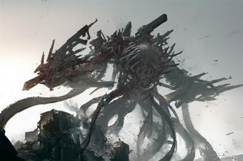 Поверхность безымянной гряды была словно поделена пополам. С одной стороны всё, насколько только хватало взгляда, было усеяно сталью. Оскаленные зевами десятков тысяч стволов башни тянулись под небеса, пока у их оснований текли настоящие реки из пушек, энергетических установок, цепей, колючей проволоки, силовых агрегатов, двигателей, моторов и одни только Боги знаю чего ещё. Несмотря на свои истоки, было понятно с первого взгляда, что творящееся действо не имело ничего общего с человеческой природой. Сталь, порох, огонь и энергия. Сейчас они больше походили на плоть, кровь, жилы и сердечный ритм. Хаотичная, но структурированная картина, буквально рвала на части любое преставление о бытие, воплощая собой что невозможно было представить. Прямо сейчас оживало то, что никогда не было живо. Медленно, но верно из земли подымался колосс. Страшнейшее из бедствий. Воплощение самых ужасных человеческих пороков. Концентрированная ненависть, возведённая в абсолют желанием разумного править, повергать и убивать. То, чья нечестивая природа взывает лишь к продолжению новой бойни, без цели и конца!