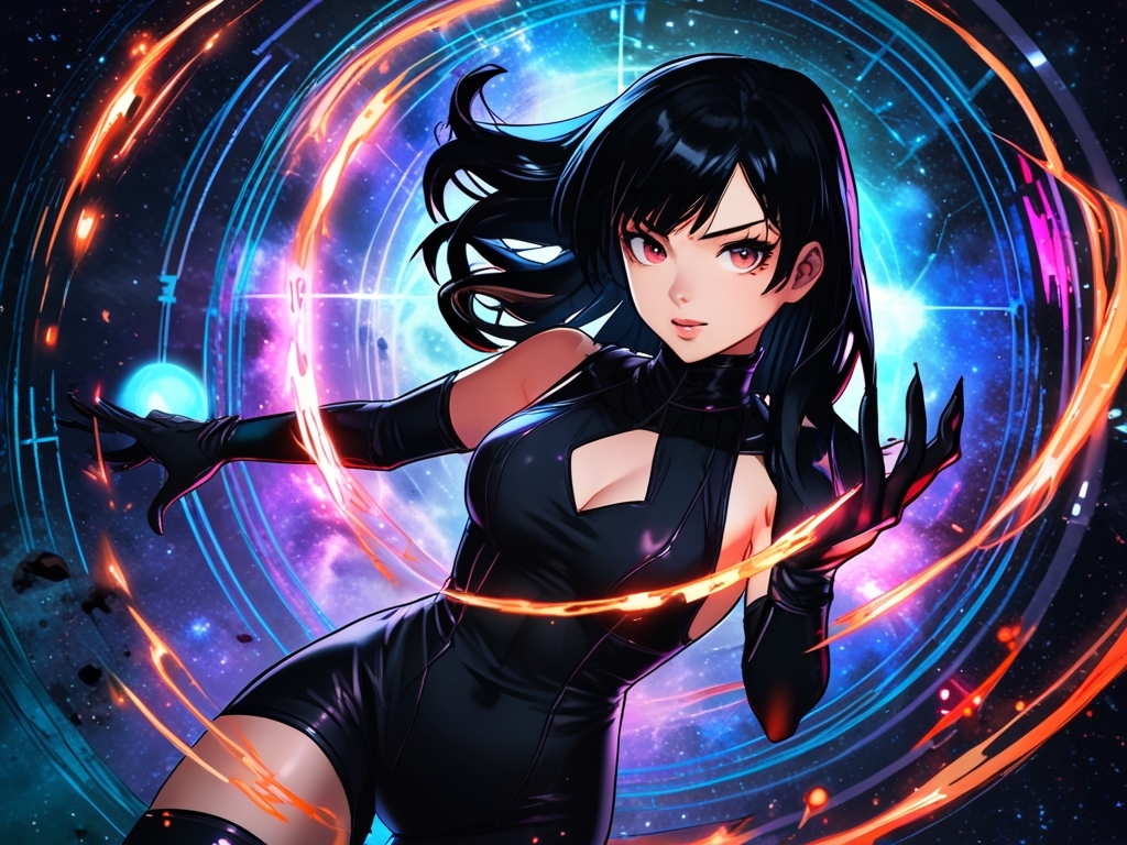 Демонолог обнаружился в этом же помещении за пределами магической печати. Вернее, это была призывательница со знакомыми чертами лица, с густыми чёрными волосами и спортивным телосложением. Облачена она была в обтягивающий серебристый комбинезон футуристичного вида. На поясе у неё висели с одной стороны бластер, с другой короткий жезл, от которого веяло мощной магией.