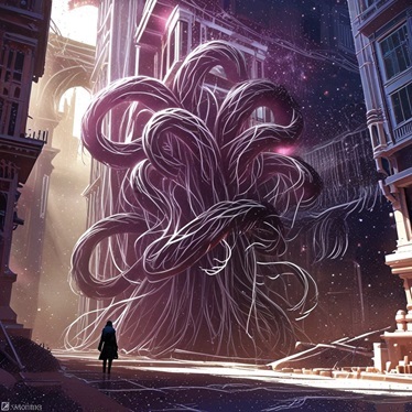 Но есть и нечто более чуждое, по типу парящей в воздухе массы… Непойми чего, явно многомерного, пузырящаяся и перетекающая тёмная масса с яркими прожилками явно смещающаяся сквозь пространство, то пропадая почти полностью, то появляясь, протягивая щупальца, растущие будто из самого пространства.