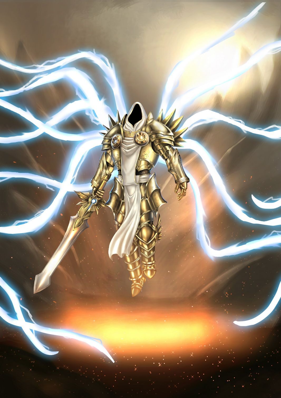 Тираэль проходит в чёрный зёв врат и тут же расправляет свои крылья, подобные щупальцам из света, его тело укрывают тяжелые латные доспехи божественного качества, составленные из многочисленных пластин вечного иридия, одной из призматических руд, пронизанных данными, составляющими высокоуровневые зачарования. В руке широкий обоюдоострый меч из того-же материала, обладающего несокрушимой твёрдостью, абсолютной остротой и столь-же добротно пронизанный ценными данными из кристаллов.
