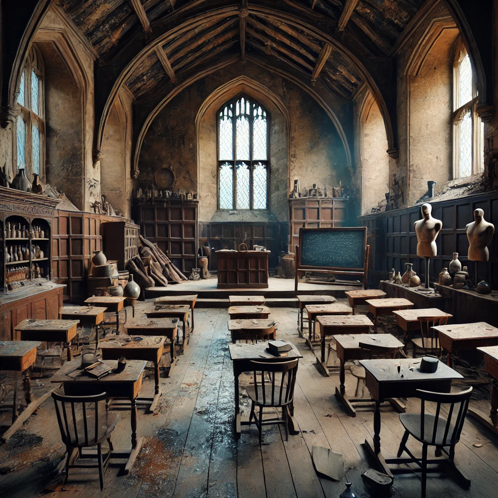 Внутри было небольшое помещение, которое явно когда-то было классной комнатой. Составленные в одну кучу парты, какие-то манекены и большая доска явно на это намекали. Правда, некоторые парты явно несли на себе следы неудавшихся зелий. Оплавленные, прожженые, покрашенные изделия и парочка испорченных котлов явно намекали на то, что кто-то здесь что-то варил.