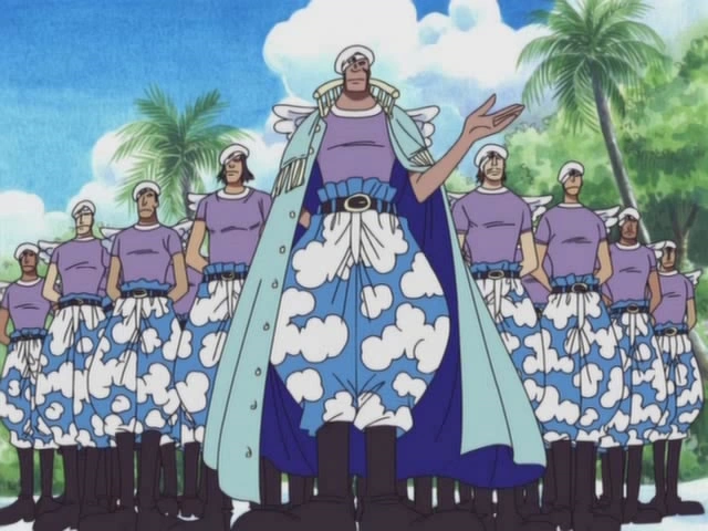 Одеты солдаты были в фиолетовые рубашки, свободные синие штаны, на которых были узоры белых облаков. На ногах они носили черные ботинки, а у старшего по званию на плечах висел голубой плащ.