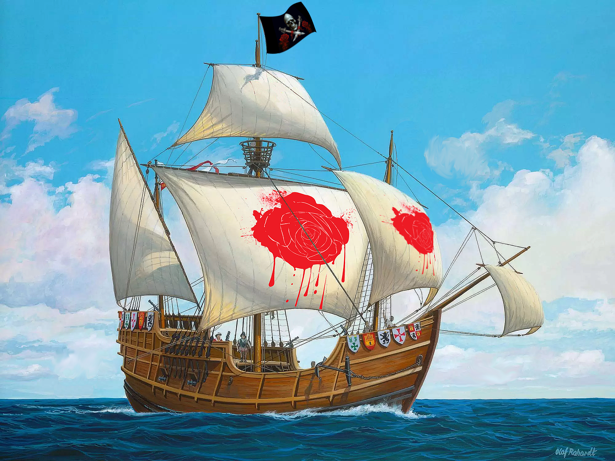 Сами паруса были белоснежно белыми, и красовались огромным узором в виде красной розы.
