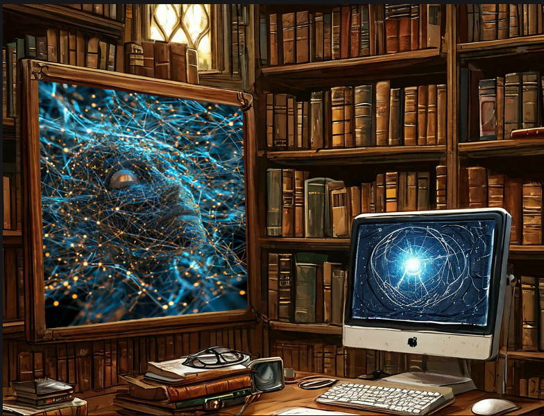 PS Верхняя картинка склеена и подогнана в фотошопе мной из двух, нарисованных Шедеврумом. Одна по запросу "какой видит себя нейросеть", а вторая — "книги и нейросети". Потраченное время примерно три минуты.