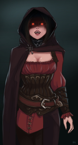 Кхм, так вот, Серана была меньше меня на голову, что, если перевести на более понятые единицы измерения, сродни ста восьмидесяти сантиметрам. Причёска похожа на ту, что показана в игре — чёрные волосы до плеч, обрамляющие лицо и две косички на голове, заплетённые на манер нисходящего венка. Черты лица слегка заострены, придавая девушке некий хищный шарм, и никаких пухлых «утиных губ», кои были так популярны у, кхм, дам в моём прошлом мире. Тут же лицо вампирши украшали слегка полноватые, но гармоничные губки. Аккуратный нос и тонкие брови дополняли картину, делая девушку довольно привлекательной особой, даже по меркам моего прошлого мира. Правда о её несколько нестандартной природе напоминали глаза, которые слегка светились в полумраке пещеры, окрашивая радужку глаз желтовато-красным оттенком. Что же касается фигуры, то тут сказать было сложно — мешала довольно свободная одежда с просторными рукавами и множеством складок на груди, а также накидка с откинутым сейчас капюшоном. Могу сказать только, что девушка выглядела стройной, а кожаный корсет выразительно приподнимал грудь, размера, эдак, второго с половиной–третьего.