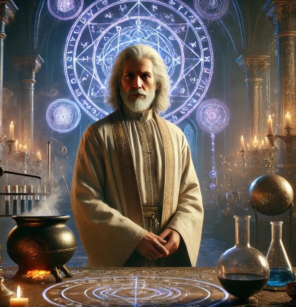 Арт (Фламель с бородой, ибо без бороды нейронка сегодня категорически отказывается генерировать картинки):