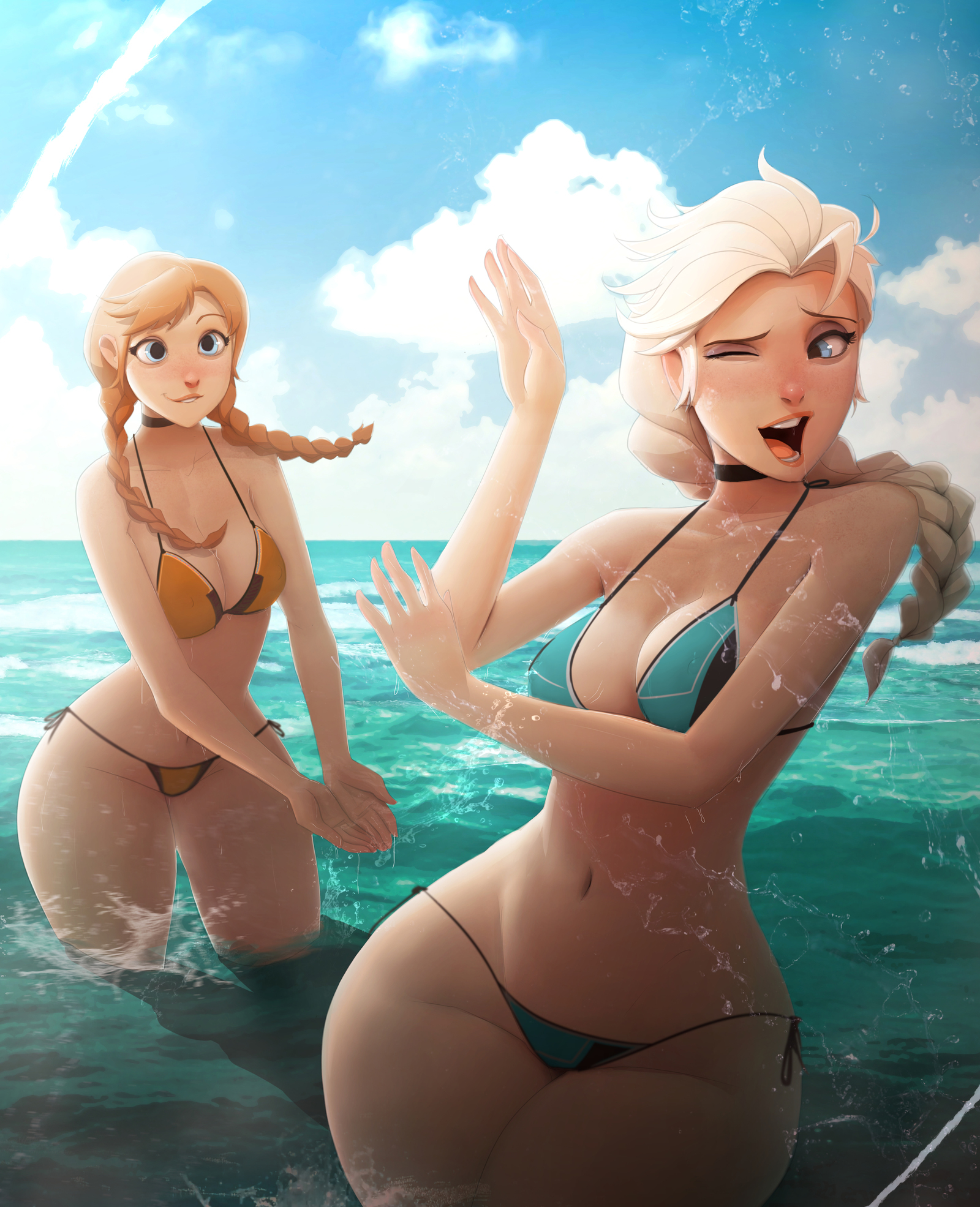 — Горячая. Я более чувствительная. — заморозив все летящие капли, Эльза элегантно завернула руки, и вода превратилась в снежок, что полетел обратно в Анну, та громко вскрикнула и засмеялась.
