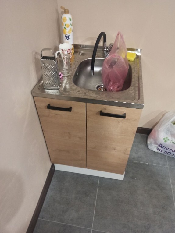 (Раковина, в ней кусок говядины для плова размораживается. Решил впервые плов с говядиной приготовить, до этого только с курицей делал. Сама раковина, тумбочка и смеситель обошлись мне в 10. Смеситель только 4 стоил. Ладно хоть раковину дешёвую нашёл, за 1,5.)