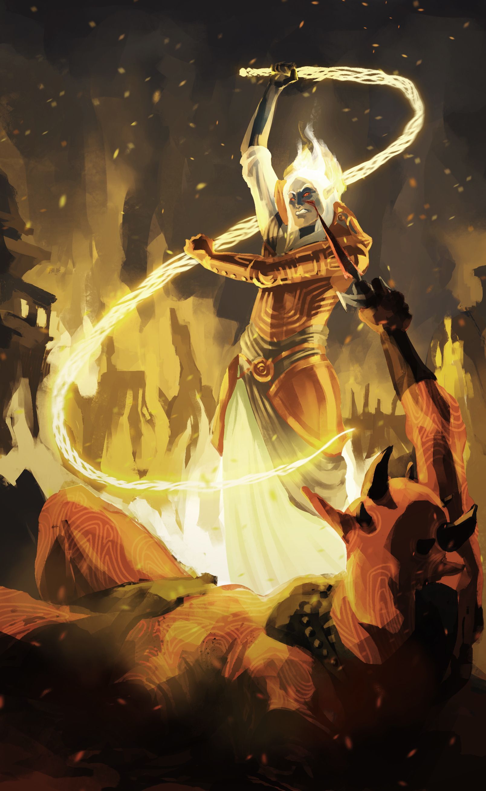 Во время сражения за нами наблюдали тысячи жителей Орсиниума. Что ж, битва между гигантом-орком и огромным бронированным драконом довольно интересна, отрицать не стану.Малакат всячески пытался размозжить мою голову, когда я сближался с ним, но я был слишком быстрым для него и мог летать, от чего попасть по мне было очень тяжело. И видимо от этого у него так сильно бомбит, что он извергает из себя пламя, распространяющееся на сотни метров, причем огонь Обливиона, то есть хаотичный и несший в себе проклятие.Концепция Тринимака была «правосудие», превращая все его атаки губительными для злых и темных существ, вроде нежити и драконов, из-за чего ему когда-то проиграл Лорхан, ведь он был очень близок к даэдра. Из-за влияния Боэтии его концепция изменилась на «проклятие», что, как понятно, придает его атакам эффект множества вредоносных проклятий. Аура этого Даэдрического Принца, наверно, ближе всего по энергетике к демонам, после меня и Мерунеса Дагона. И поэтому огонь мне вреда причинить не может, ибо я и сам даэдра, имею аркан и Воплощение Дракона, тем более я сильнее него, чего нельзя сказать о жителях Орсиниума, однако я защитил их заранее барьерами. Обычно Малакат защищает своих последователей, но тех, кто от него отворачивается, он карает. К тому же сейчас он находится в том положении, когда невозможно победить, сдерживаясь и не жертвуя своими последователями.