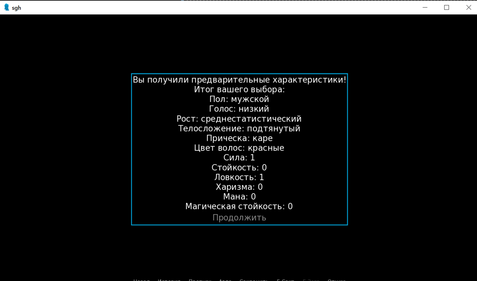 Здесь вы видите итог, полученный из создания персонажа через "текстовый редактор персонажа", для будущей игры в стиле "текстовое приключение".