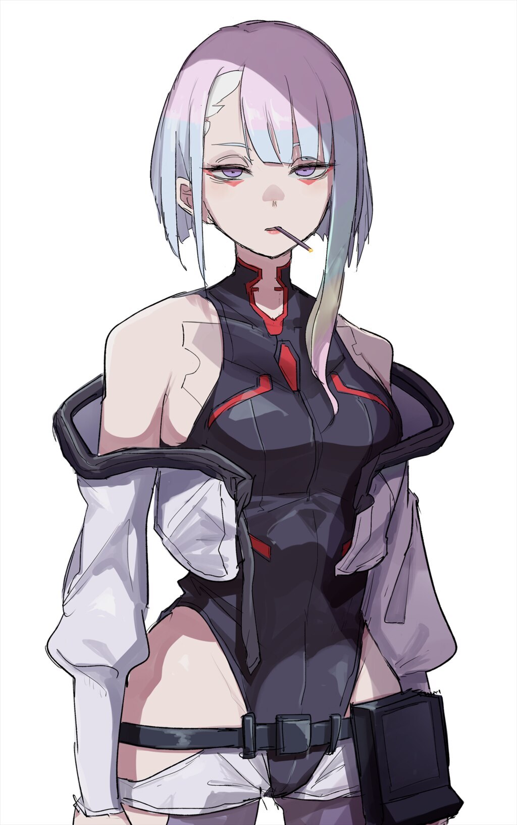 Дабы не светить лицом на людях, я накинул на себя капюшон, но кое-кто меня всё-таки заметил, точнее, на выходе из палаты в мою грудь случайно врезались. Это была молодая девушка азиатской внешности со светло-фиолетовыми глазами и белыми волосами, подстриженными раздельным бобом — левая сторона оставлена длиннее — и окрашенными в белый радужный градиент с отливом. Стиль её одежды — китч, смешанный с неомилитаризмом: она носит укороченную белую куртку с чёрным комбинезоном нетраннера с красными вставками поверх пары белых шорт и высоких серых чулок, а также чёрные сапоги до колен.