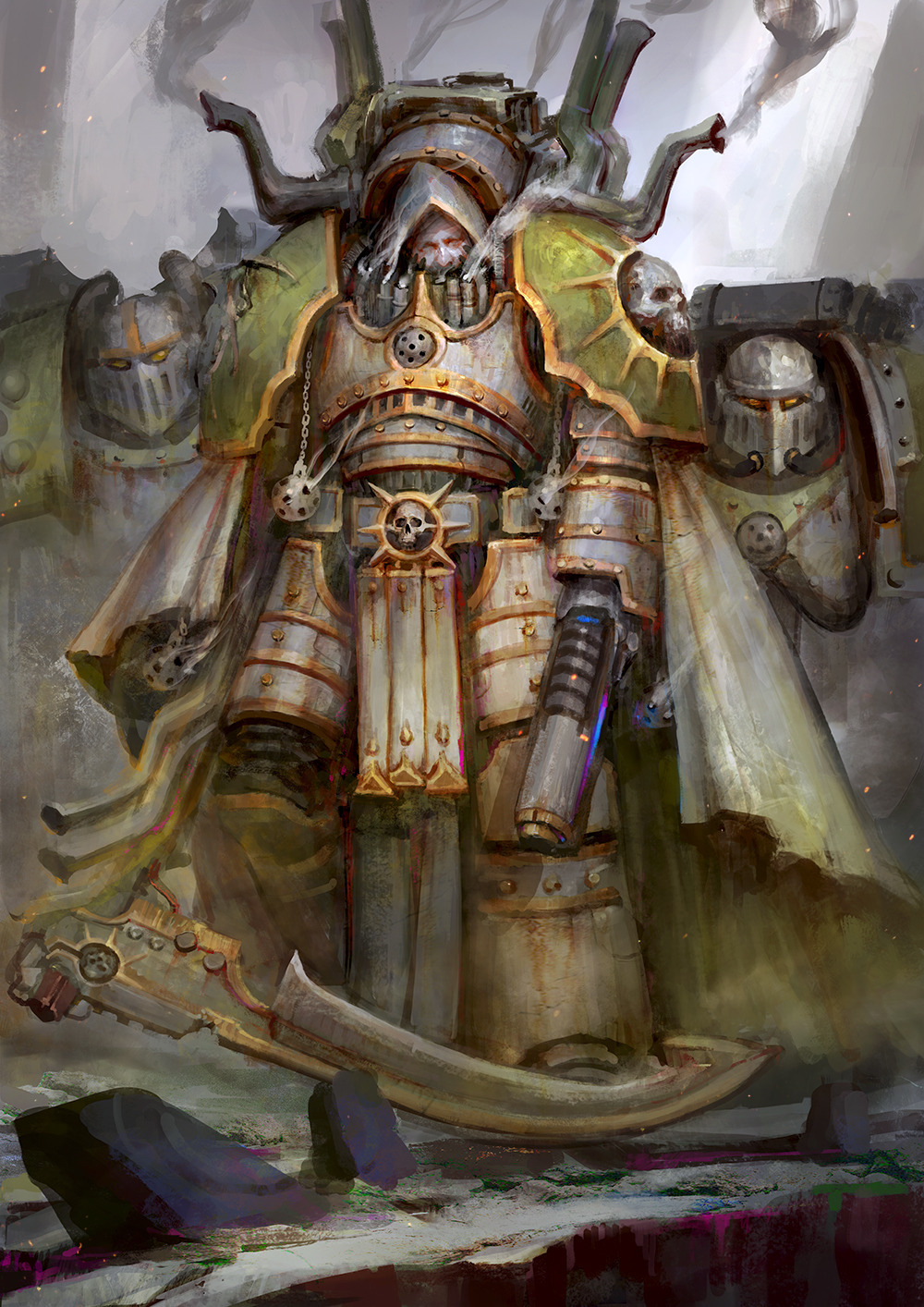 А Мортарион с первого взгляда был довольно яркой и специфической личностью. Одетый в жёлто-белый доспех и скрывавший под тёмно-зелёным плащом бледное лицо, на его спине также находился какой-то чан с химикатами или, скорее, устройство по работе с ними?