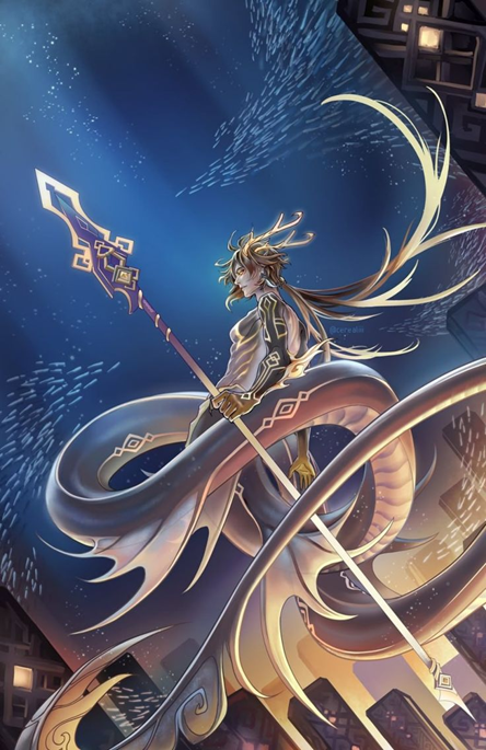 Тем временем тело его начало изменяться. Так, как закладывал это фрукт, подготавливая сосуд к полной форме… Руки и ноги удлинились: Моракс стал выше и больше. Чутка раздался в плечах. Начали расти и волосы на голове, среди которых пробивались крошечные рожки. Поначалу крошечные, но быстро ставшие загнутыми к затылку прямыми рогами, с парой мелких “веточек” на них. Сквозь облегающий чёрный наряд прорезались гребни: на руках, на ногах, на шее… и часть лица покрылась чешуёй тёмного отлива. Последней же каплей стал хвост… огромный, длиннющий и неосознанно извивающийся. С гребнями, плавниками, кисточками… гладкий, с тонким узором светлой линии.