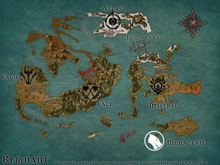Мы сейчас находимся в Вейле, который располагается в восточной части самого большого континента в этом мире, Санус. В западной части этого же континента находится Вакуо. На северном континенте, Солитас, находится Атлас, самое развитое королевство в мире. Последнее королевство, Мистраль, находится на восточном континенте, Анима.