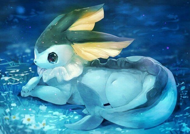 В отличии от остальных эволюций, у этой не было шерсти: голубая кожа, светло и тёмно-зелёные плавники, и массивный рыбий хвост, слегка напоминающий акулий. Вместо ушек — три… возможно плавника, но, сдаётся мне, приспособления эти нужны для лучшей ориентации именно под водой, а не на суше. А ещё, если приглядеться, то на лапах, между пальцев, можно заметить мембраны… это на случай, если основной ареал обитания этого покемона до сих пор не очевиден.