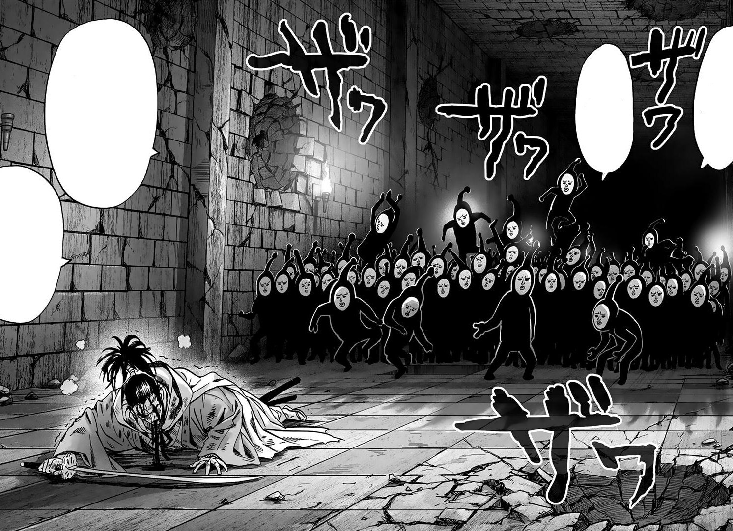 Двигаясь на той скорости, что не тратила мою выносливость сверх нормы, я покинул пещеру и отыскав подходящий коридор, направился в нужную сторону. По дороге, мне естественно встречались небольшие группы монстров, но все они, для нынешнего меня, были такими слабаками, что я почти их не замечал. После драки с ниндзя, чьи имена я так и не узнал, и не вспомнил из знаний канона, кровь во мне буквально бурлила. Будучи готовым встретиться с кем угодно, пусть даже им окажется сам король монстров Орочи, что определённо будет гораздо сильнее меня, я завернул за последний поворот и наконец увидел сцену сражения, ради которой сюда и пришёл. Вернее будет сказать, увидел я уже последствия этой драки — валяющегося на полу, побитого Атомного Самурая, а также хихикающую и улюлюкающую толпу из десятков и сотен карикатурно просто выглядевших одинаковых монстров.