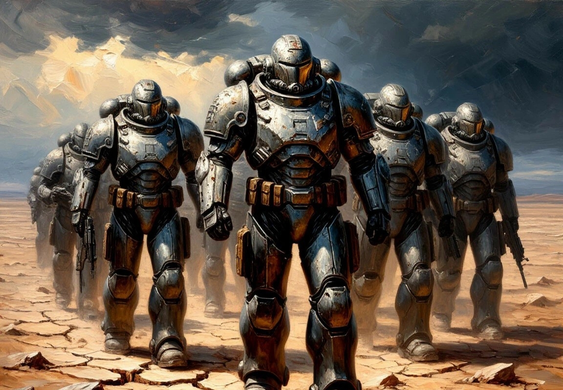 Металл скрипел, цепляясь за рёбра, будто пытаясь вживиться в плоть. Легионер приподнял шлем, втянул воздух, пахнущий машинным маслом и потом. Силовая броня — два с половиной центнера стали, керамики и электронной начинки — висела на стойке, как старинные рыцарские доспехи. Каждый сустав, каждая пластина требовала точной подгонки. Инженер в оранжевом комбинезоне щёлкнул тумблером, и броня ожила: гидравлика зашипела, смыкаясь вокруг тела.
