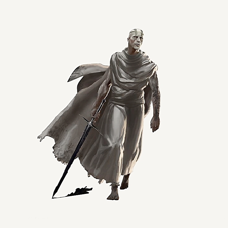 Лысая голова полная шрамов, две линии ожогов шедшая через оба глаза, такие же шрамы украшали и его руки, белая кожа обрамленная сетью морщин с просвечивающими через неё венами. На лице выделялись жёлтые глаза и чернеющий дёсны зубов. Человек перед мной был одет в белые потрёпанные тунику и накидку.