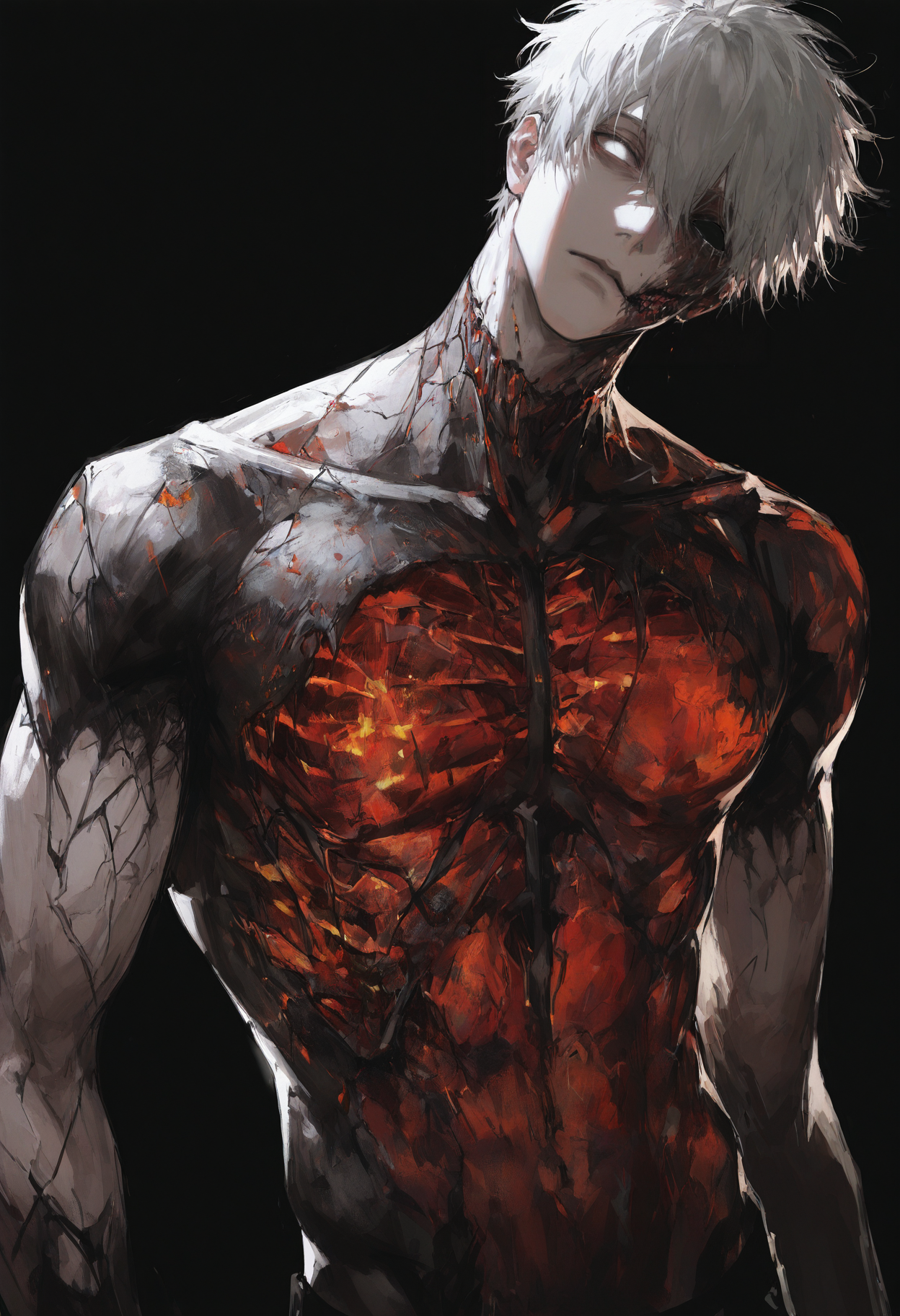 Чёрные обугленные руки с пульсирующими мышцами, вокруг которых плясали остатки пламени. Торчащие из груди вывернутые рёбра, через которые проглядывались ошмётки лёгких. Лицо, частично оплавленное, с отчётливо видной нижней челюстью, обнажённой до кости. Правый полностью вытекший глаз, смотрящий на неё тёмным провалом, а левый — целый, был настолько белым, что в нём нельзя было увидеть зрачок, но даже так чемпионка чувствовала, что регенератор неотрывно наблюдает за ней.