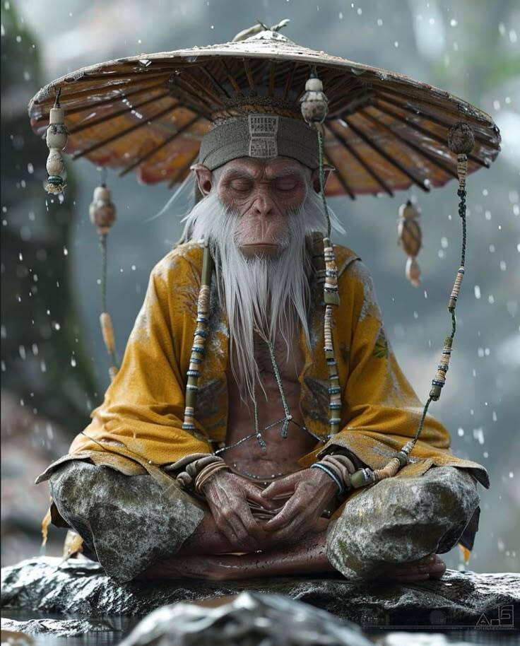 На камне сидела седая обезьяна с шляпой на голове и в жёлтых одеяниях.