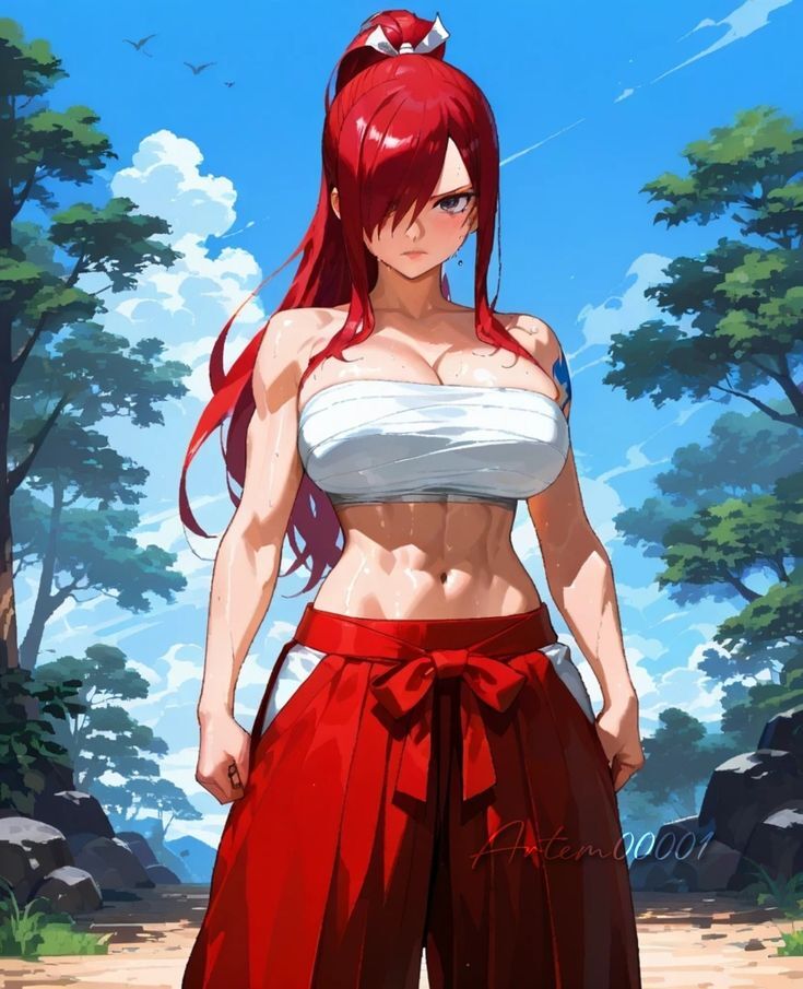 В следующую же секунду она поменяв свой доспех и оставшись в одних красных шароварах и с перемотанной бинтами грудью, помчалась прямо парня орудуя двумя катанами.