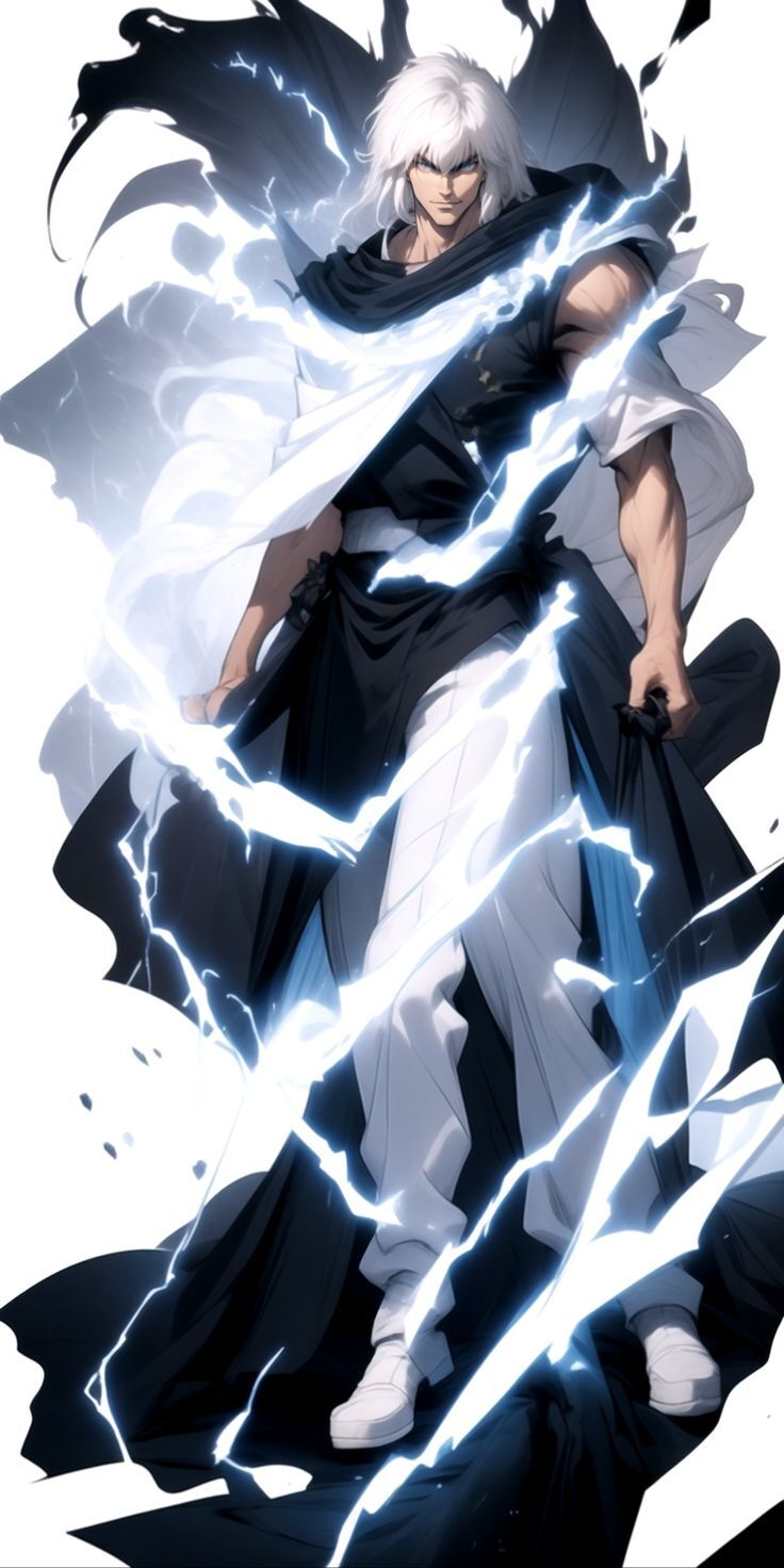 (На просторах "Пинтереста", сайта с артами, я нашёл вот такой вот образ мускулистого беловолосого парня. Вроде это герой какого ни будь аниме. И решил взять его за основу преобразившегося героя.
