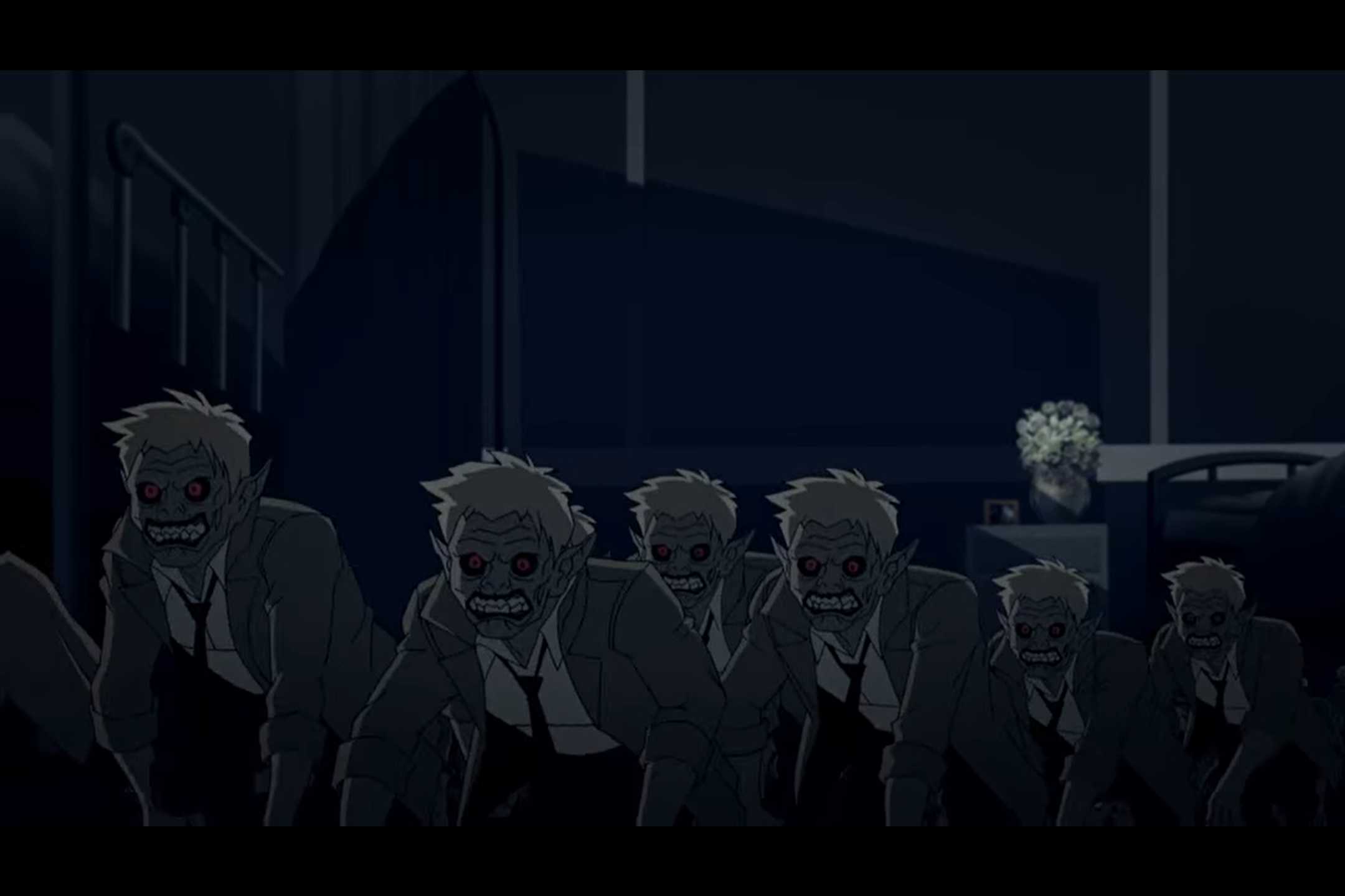 Тот же бежевый плащ, белая рубашка, красный галстук и темные брюки, даже золотистые волосы были в наличии, вот только существа были в высоту около тридцати сантиметров, а еще имели внешность каких-то зубастых серокожих гремлинов.