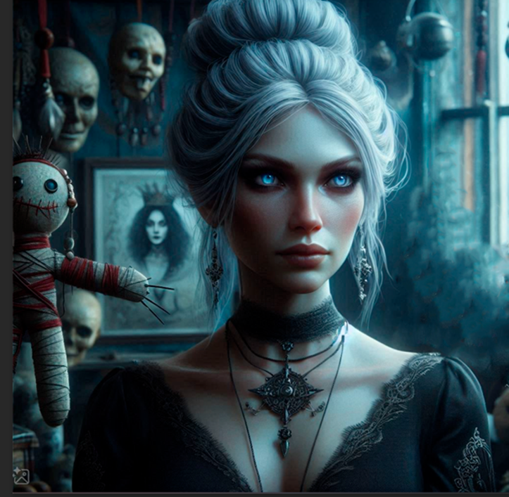 Ведьма в тёмном платье, длинном и струящемся, выполненном из лёгкой и подвижной ткани, изящно окутывающей её фигуру, подчёркивая каждый изгиб. Серебристые волосы казались седыми, но по её молодой внешности этого не скажешь.
