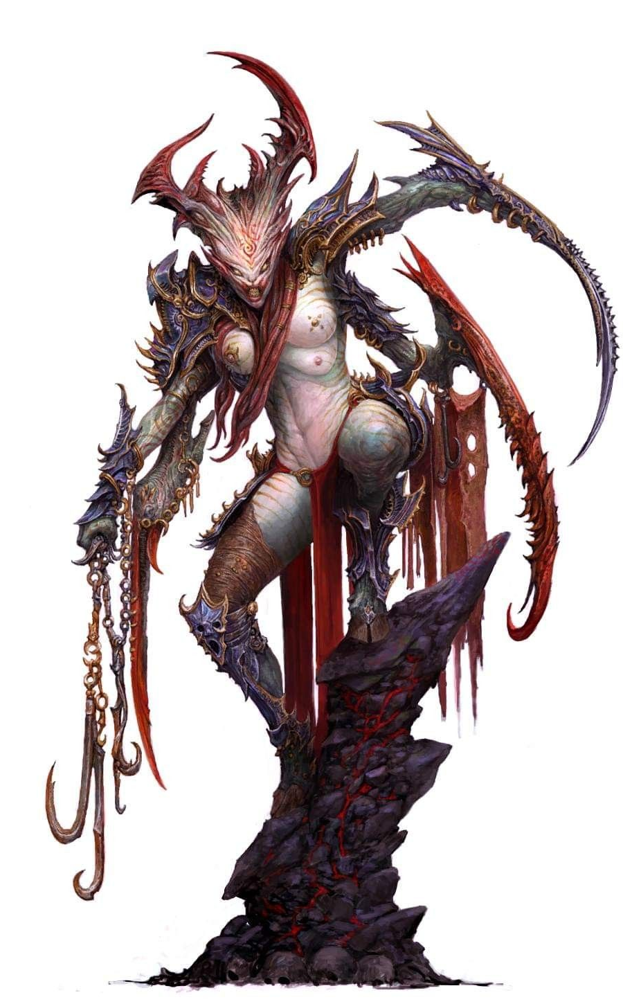 Совершенно не аппетитное зрелище, то что когда-то было женской фигурой, теперь больше напоминало рисунки каких-то извращенцев психопатов. Вместо головы непонятное костяное нечто с рогами и щелями для глаз. Три руки больше напоминавших передние лапы богомола, две с одной стороны и одна с другой. С той стороны где были две расположенные друг под другом руки было две груди, также расположенные одна под другой. Ноги этой твари заканчивались копытами как у каких-нибудь чертей или демонов. Вся она выглядела просто отвратительно.