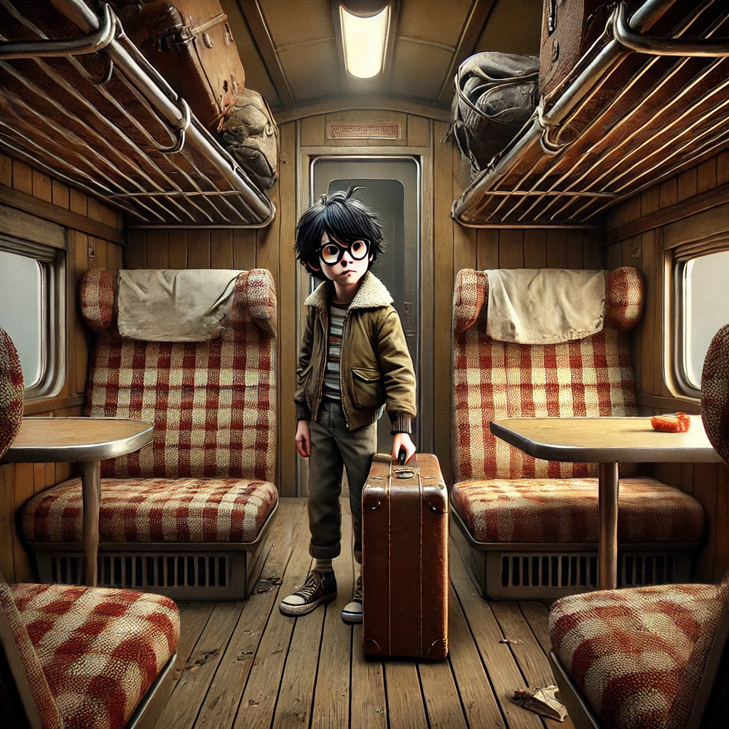 С непередаваемым выражением лица Гарри оценил ретродизайн купе вагона, а ещё «порядок» в нём же: застарелые потёки от чего-то сладкого на столе, старая латаная-перелатаная и износившаяся клетчатая тканевая невзрачного цвета обивка на сидениях.