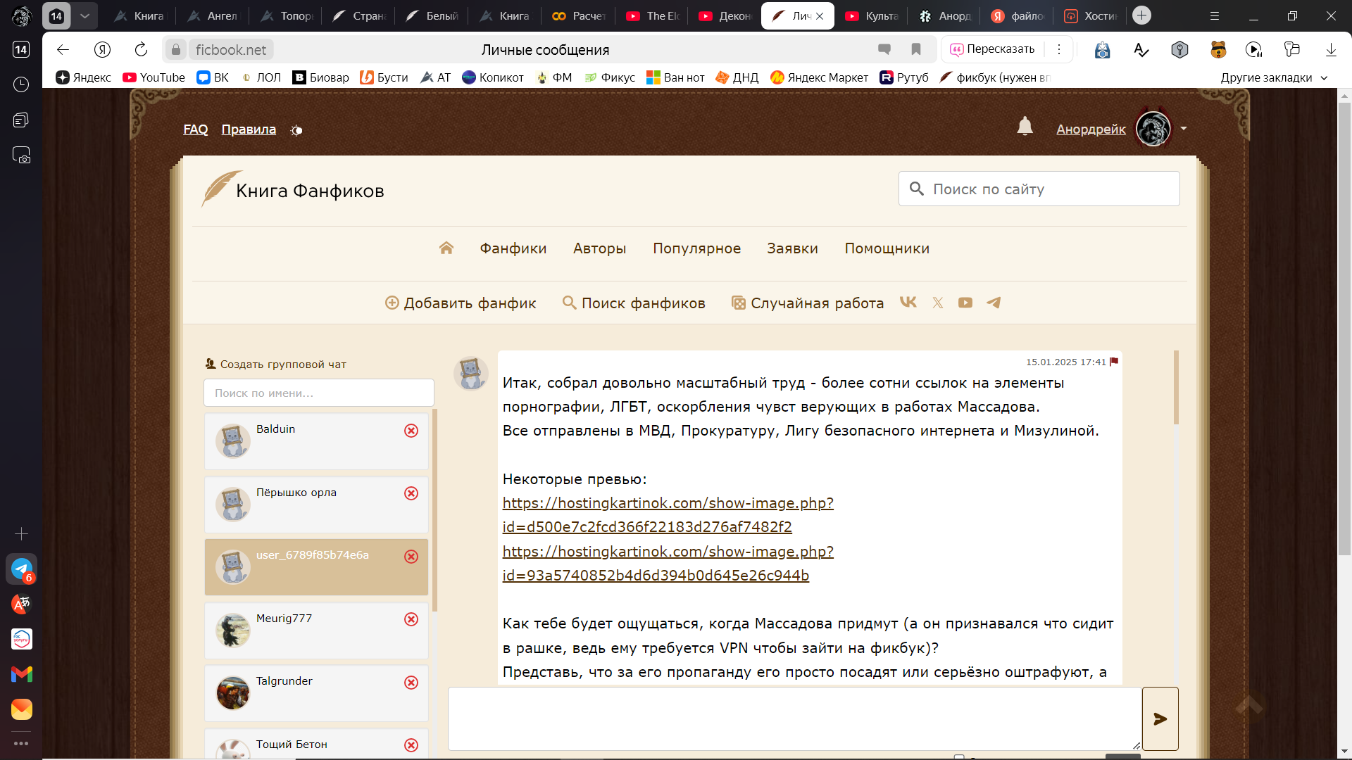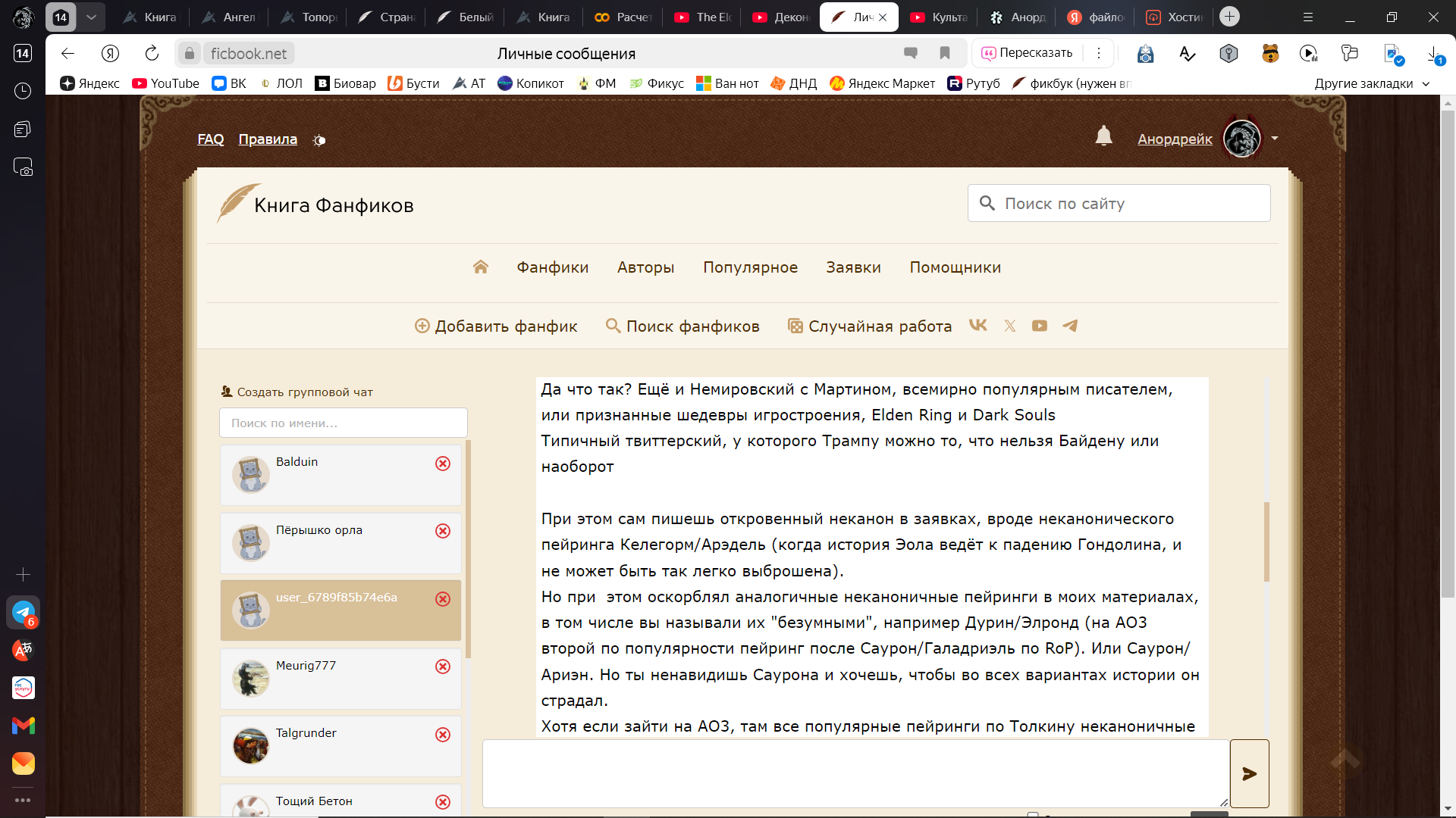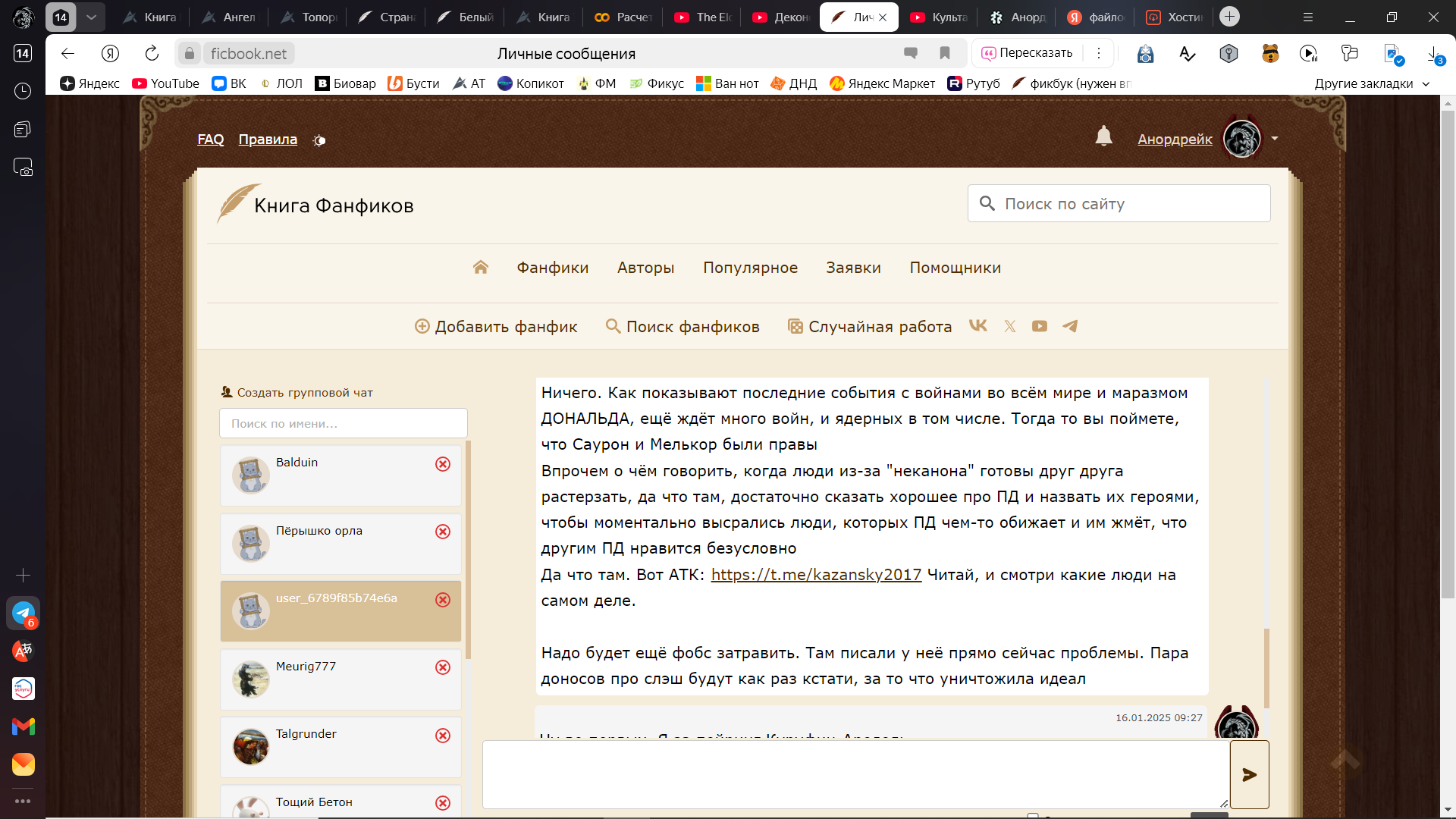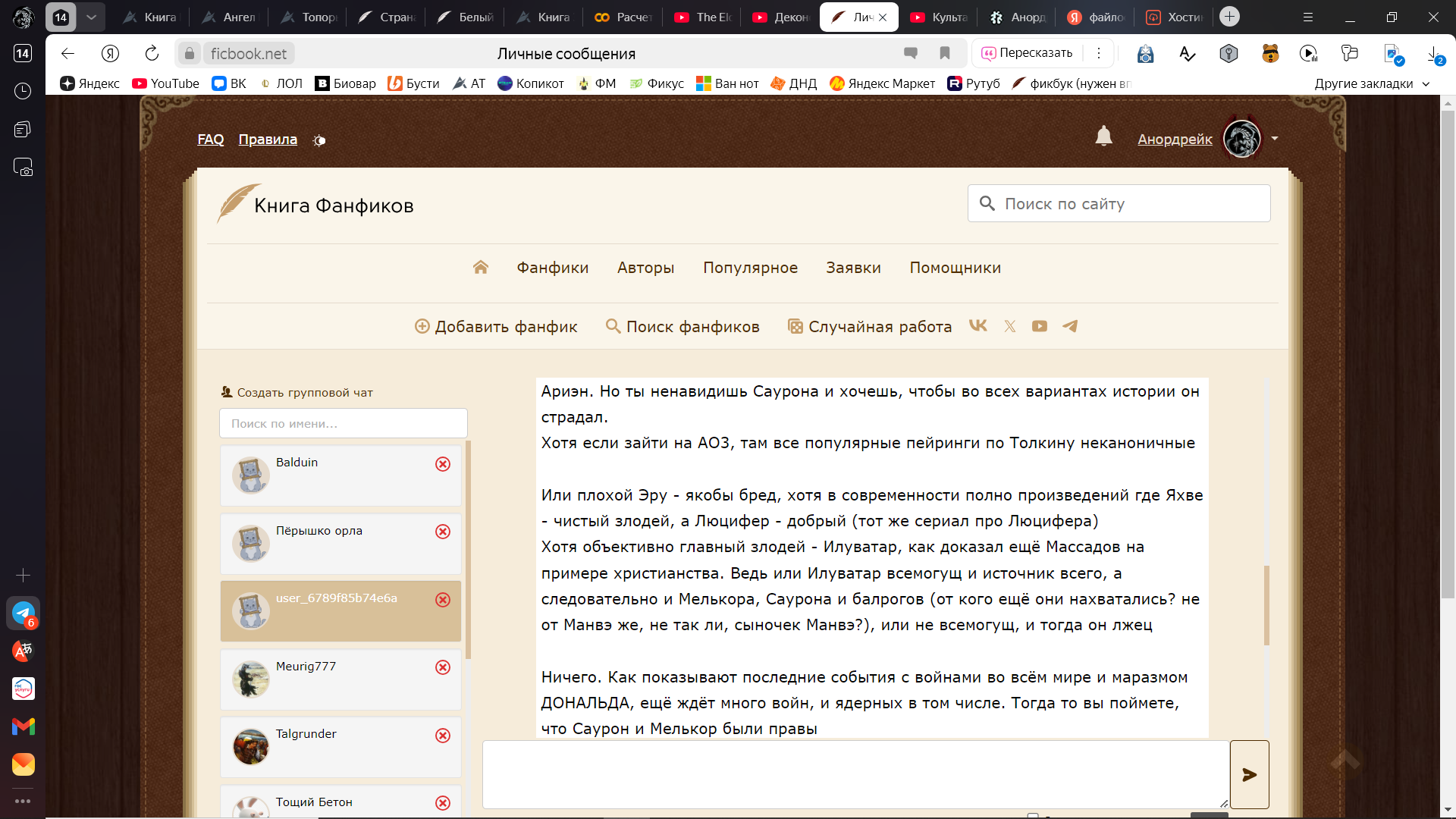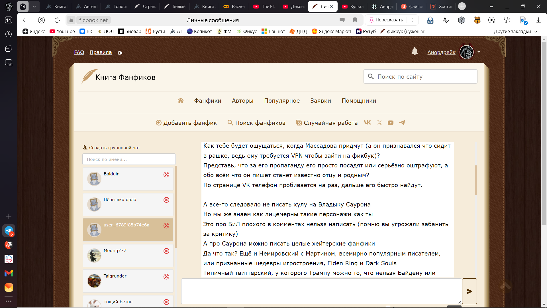 В мою личку начали спамить потоком малосвязного бреда, касающегося как реала (к примеру, попытки сыпать угрозами в адрес другого читателя балдуина, хотя казалось бы причем тут блять я. Где я, имперец чистой воды, а где ЛГБТ?), так и фандома толкина: